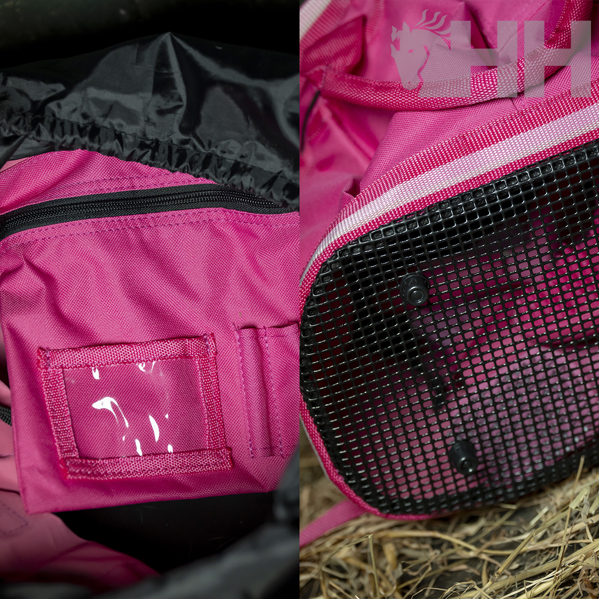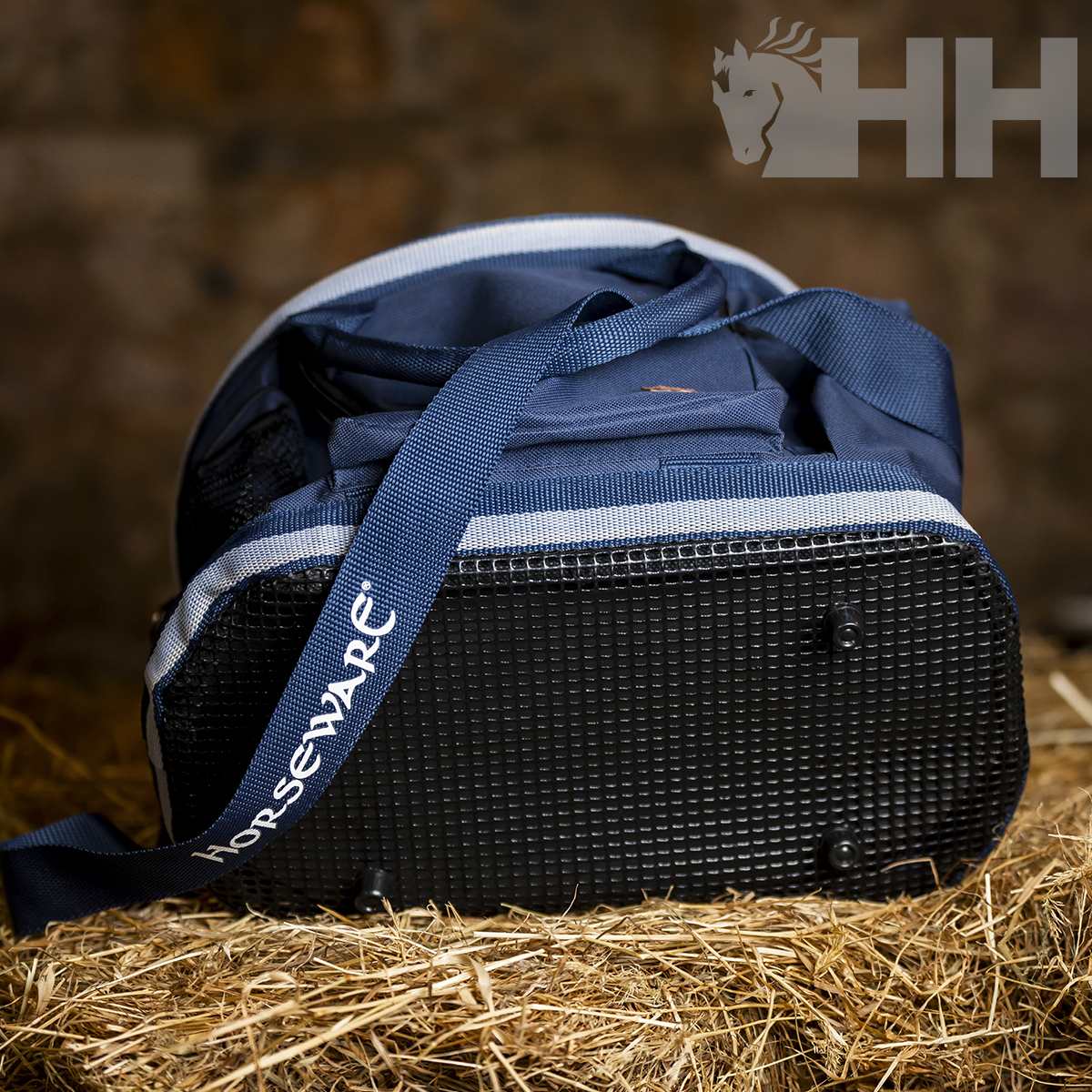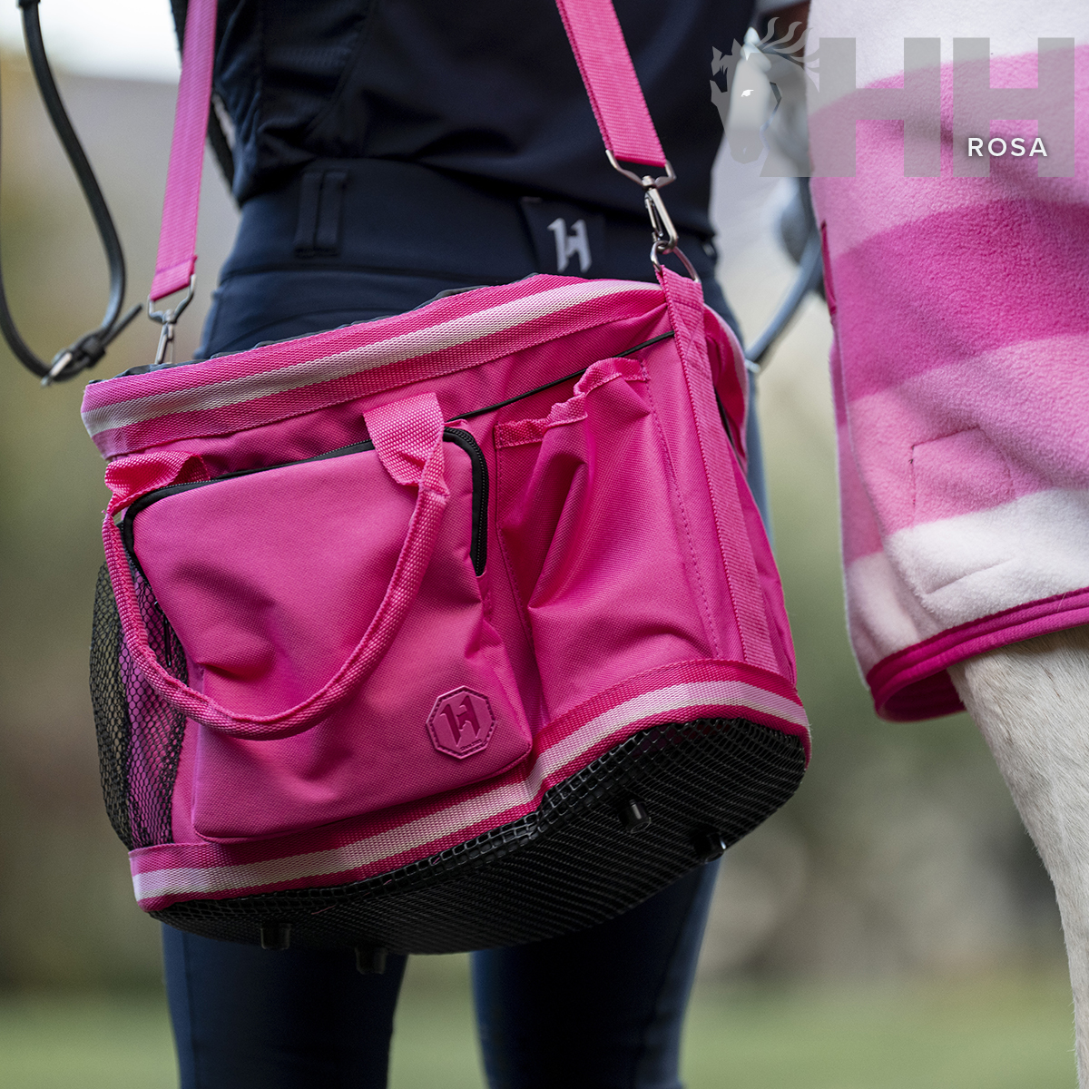 - Bolsa robusta e duradoura de poliéster com cordão superior, base de malha e correia extraível.