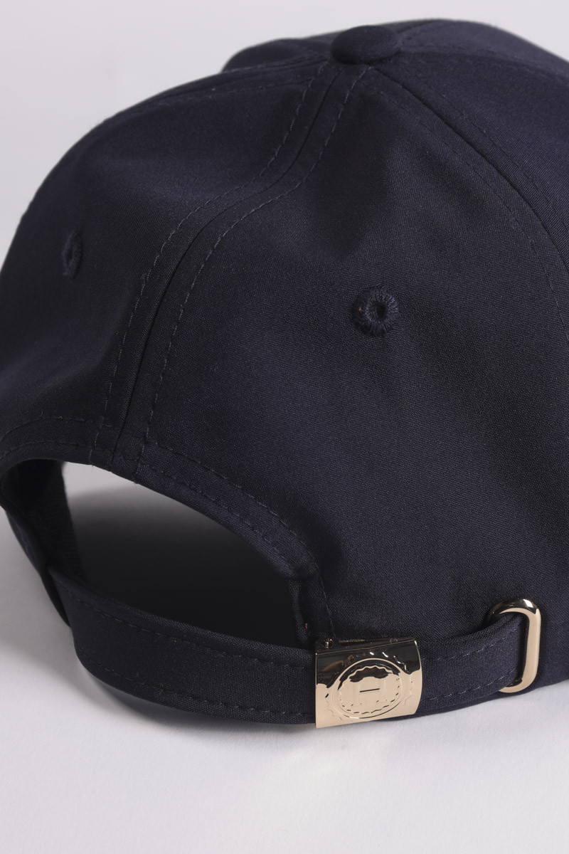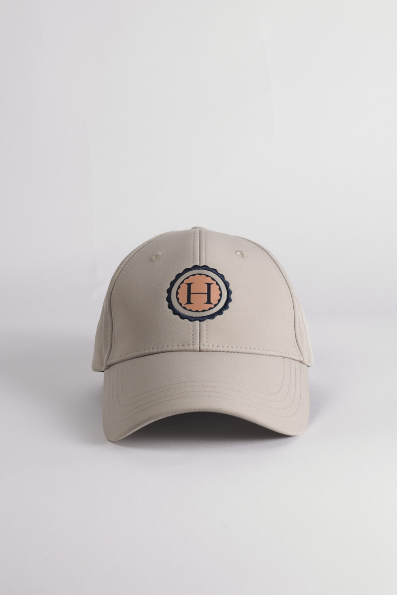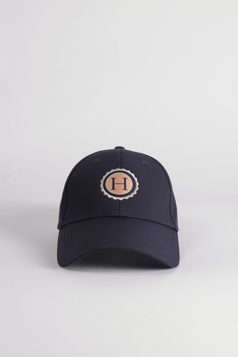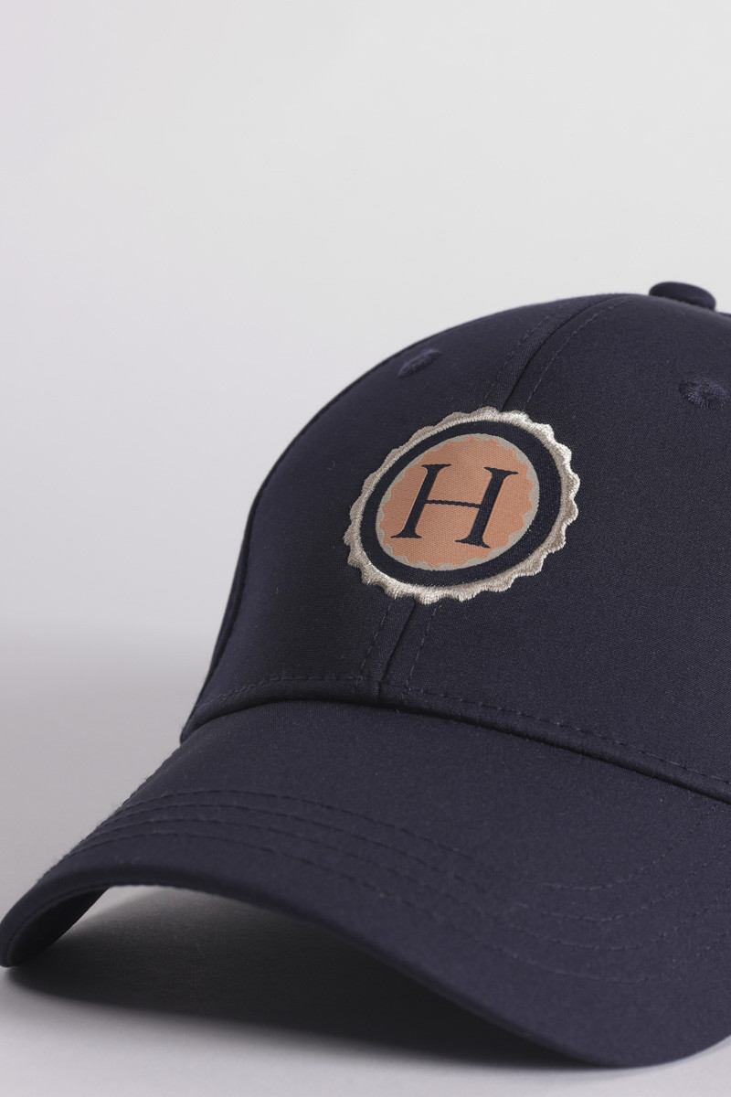 Emblema do logótipo Harcour na frente do boné.