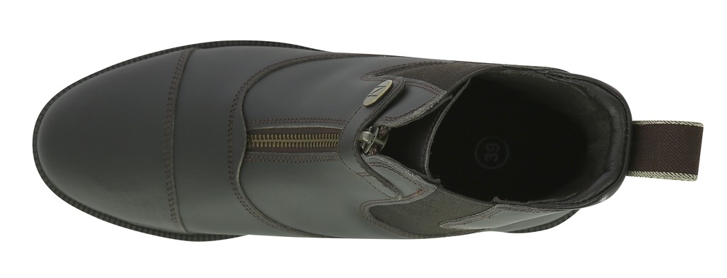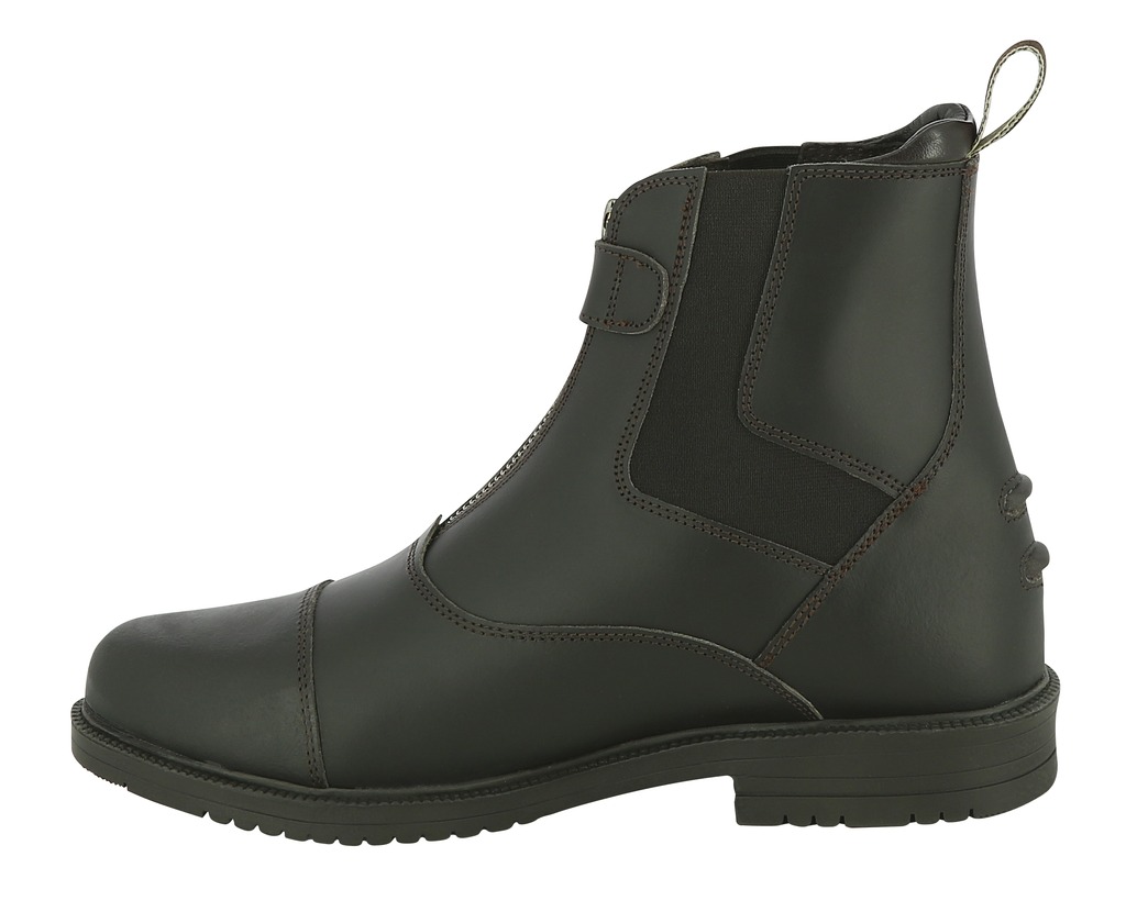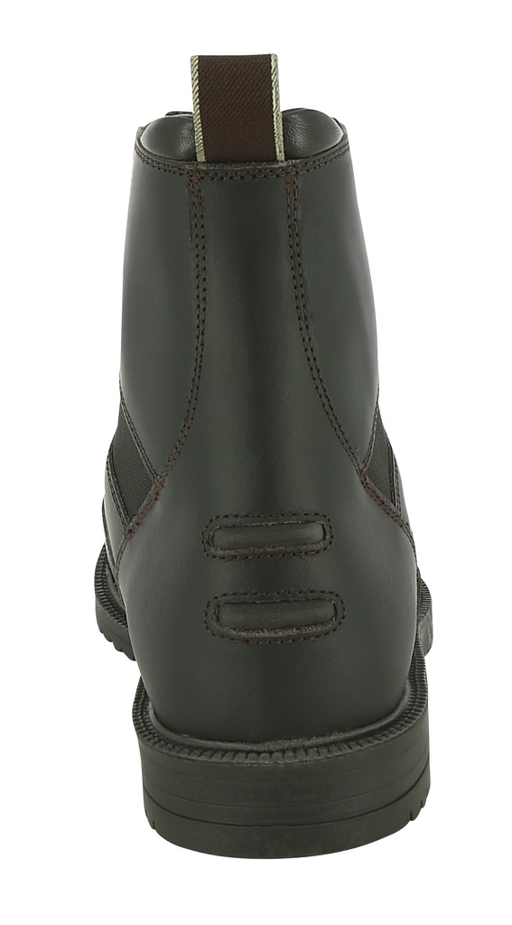 Botins forrados de couro de porco com parte superior de couro de vaca ensebado. Com fecho dianteiro e botão de pressão. Sola de borracha espessa e dentada. Fole elástico. Sola e talão antideslizantes. Com tacos de esporins.