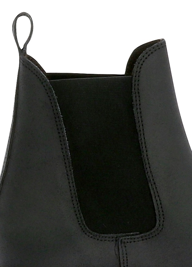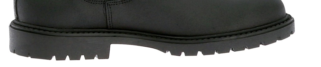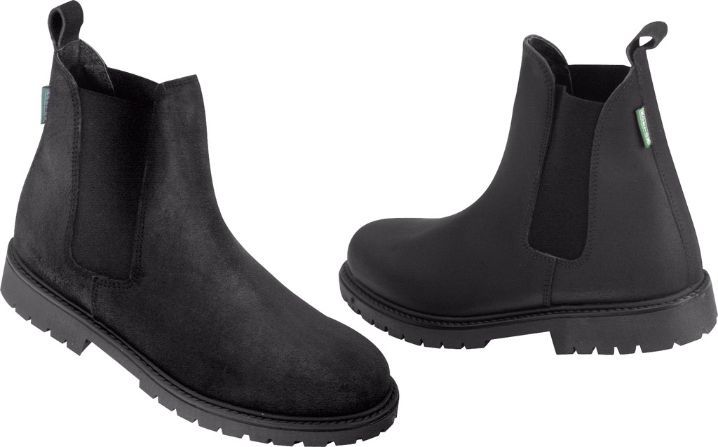 Exterior de couro de vaca ensebado. Sola grossa de borracha com tacos. Fole elástico. Sola e talão antideslizantes. Cano e ponta forradas de couro granulado, pé de couro volto.