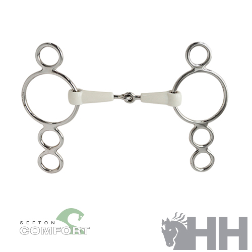Nova colecção SEFTON COMFORT. A embocadura é fabricada com um material termoplástico de alta qualidade que estimula a mastigação suavizando o contacto com o cavalo. Este contacto com a boca é muito estreito e refinado e, portanto, produz um conforto muito alto e ajuda a que a disposição do cavalo para actuar seja muito alta. O núcleo interno da embocadura é de aço inoxidável.