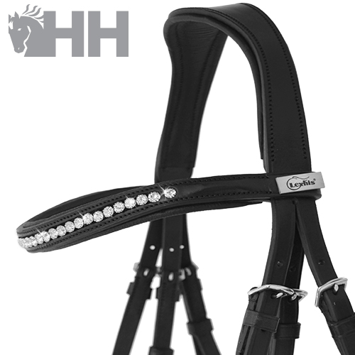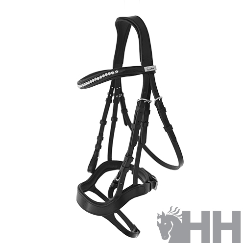 Cabeçada para bridão com um só montante e fabricada com couro de primeira qualidade e ferragens de aço inoxidável. Elegante testeira com cristais.
