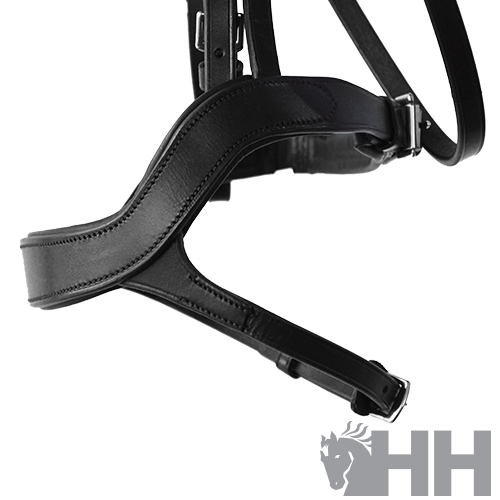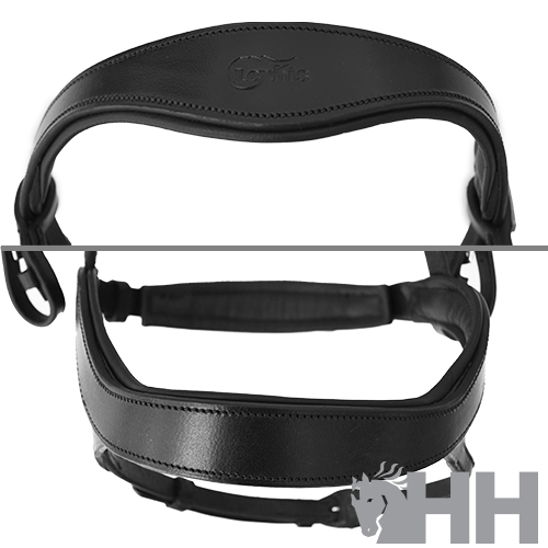 Focinheira anatómica com moderno design para proporcionar um excelente conforto ao cavalo e focinheira dupla incorporada. Inclui rédeas de couro lisas.