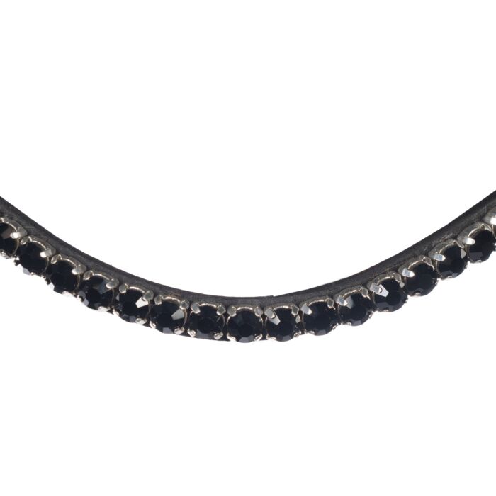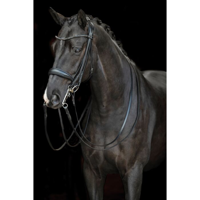 Cabeçada de freio-bridão em couro de qualidade e ferragens de aço inoxidável. Testeira anatómica com pedras grandes e removível através de mola. Focinheira e cachaceira acolchoadas com couro macio. Com ganchos nas faceiras e rédeas. Ajustável com fivela na zona da cachaceira.