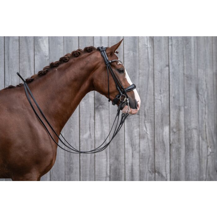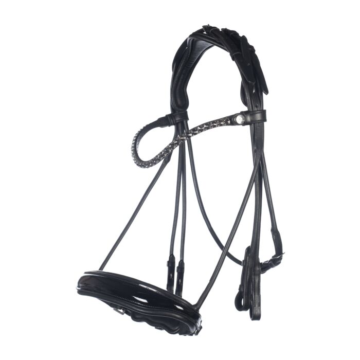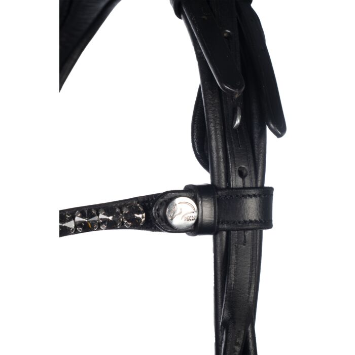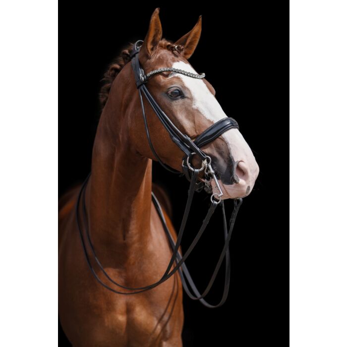 Cabeçada de freio-bridão em couro de qualidade com fivelas de aço inoxidável. Em formato anatómico para um ajuste ideal.