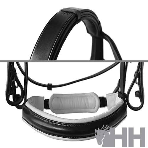 Cabeçada para freio-bridão fabricada com couro de primeira qualidade e ferragens de aço inoxidável. Focinheira acolchada extra larga (5 cm de largura na parte interior) e cachaceira acolchoada.