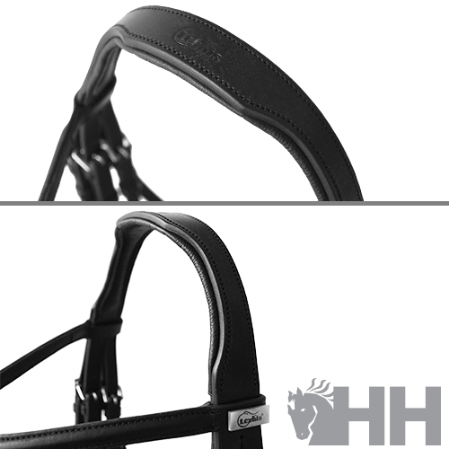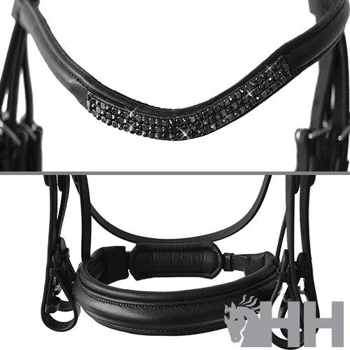 Cabeçada para freio-bridão fabricada com couro de primeira qualidade e ferragens de aço inoxidável. Focinheira acolchada extra larga (5 cm de largura na parte interior) e cachaceira acolchoada anatómica. Testeira decorada com uma discreta banda de cristais centrais.