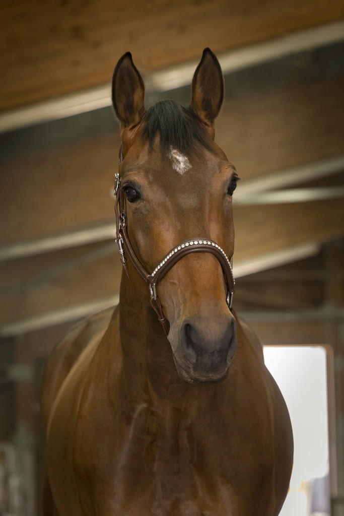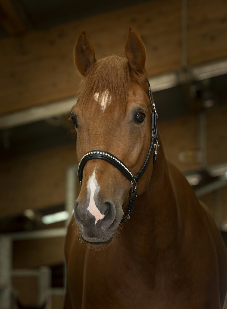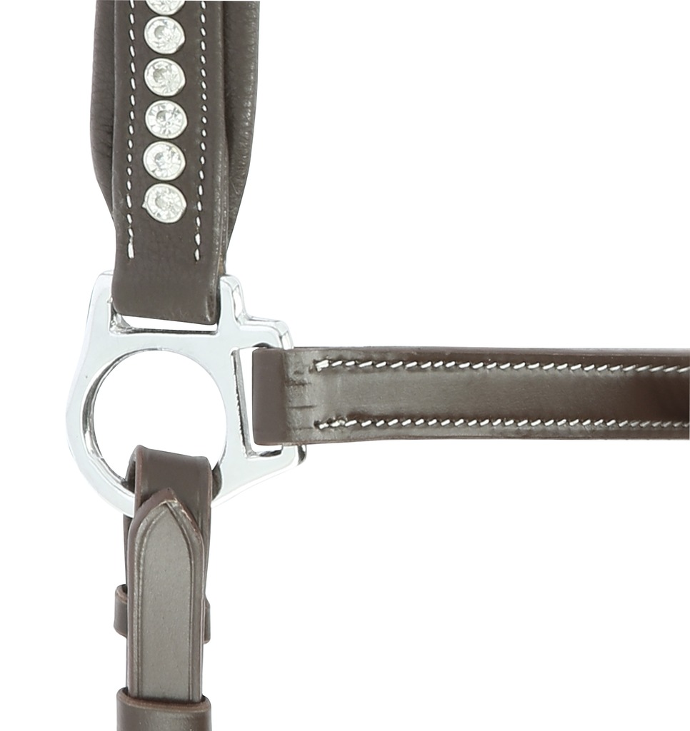 Cabeção de couro de búfalo, com cachaceira anatómica de duplo ajuste, forrada de couro de vaca. Focinheira ajustável realçada com brilhantes transparentes e forrada de couro de vaca. Costuras negras para o couro negro e brancas para o couro havana. Ferragens de aço inoxidável.