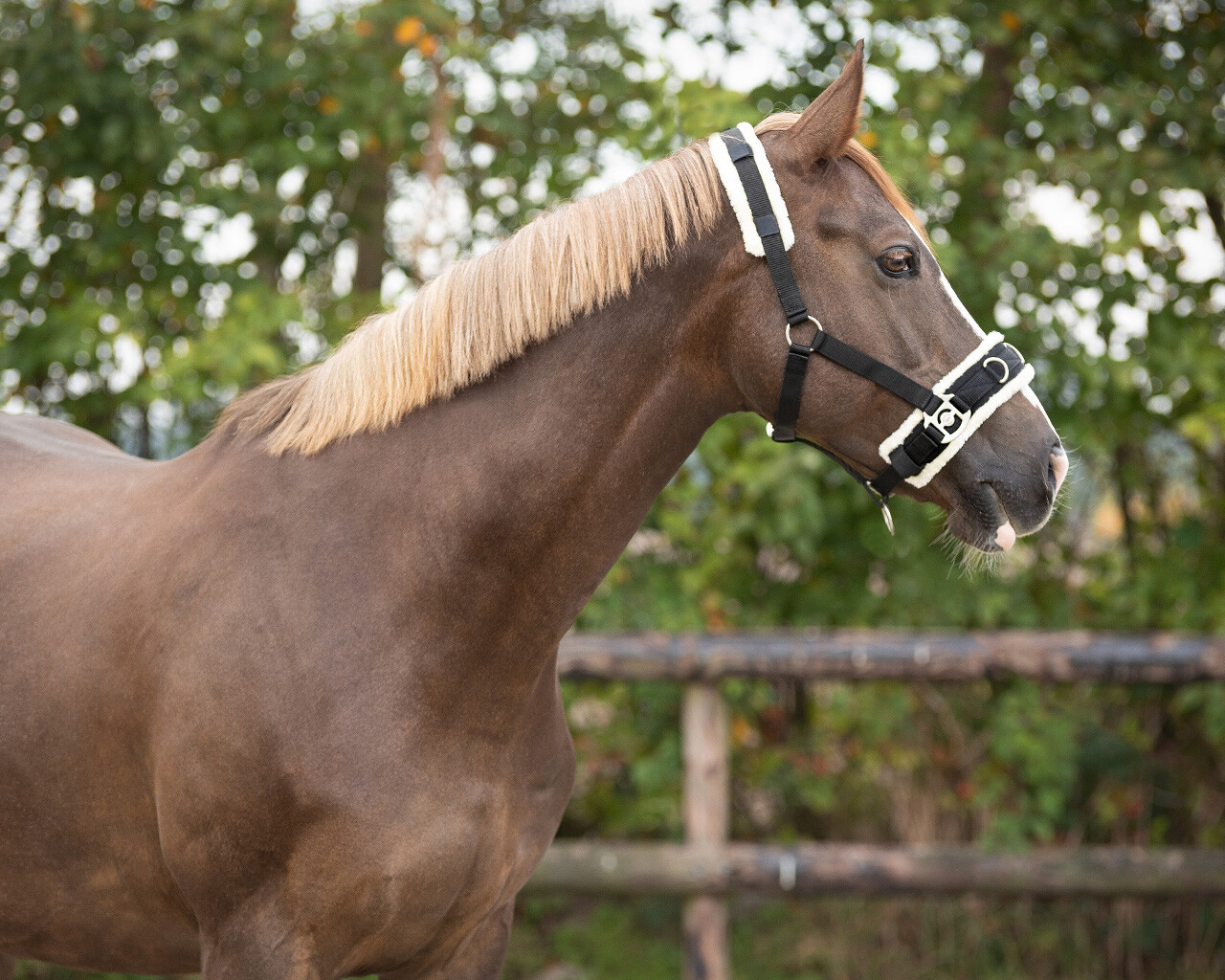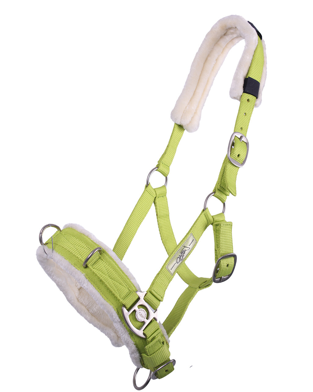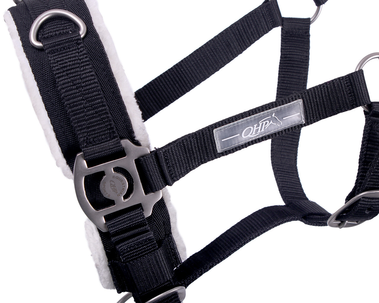 Ajustável em três pontos e com protecção de pêlo sintético na focinheira e cachaceira. O pêlo na cachaceira pode ser retirado.