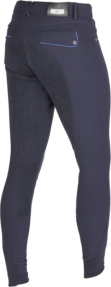 Calças de montar de homem com microfibra e algodão para um maior conforto. Costuras a contraste e rebordo nos bolsos traseiros. Assento completo em camurça sintética elástica.