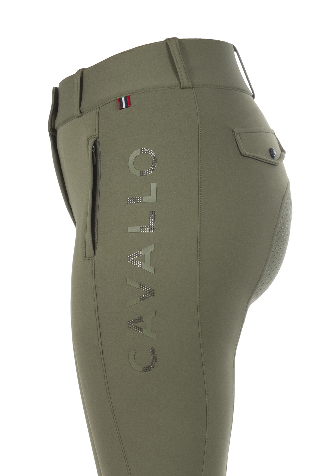 - Estribo Cavallo com cristais brilhantes acima do bolso direito;