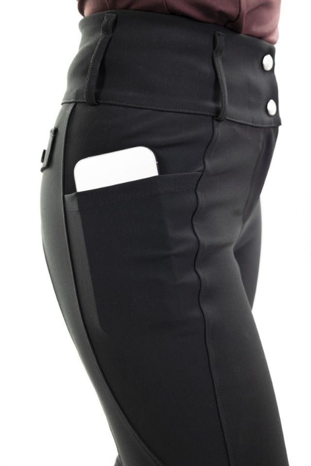 Calças de senhora, de corte justo e cós alto e modelador.