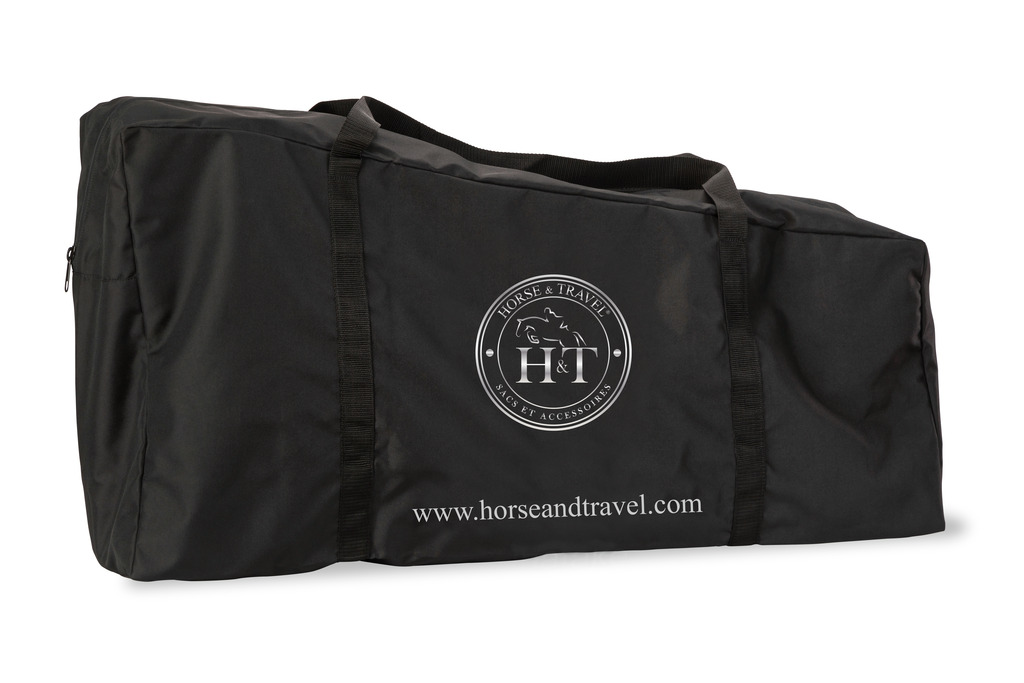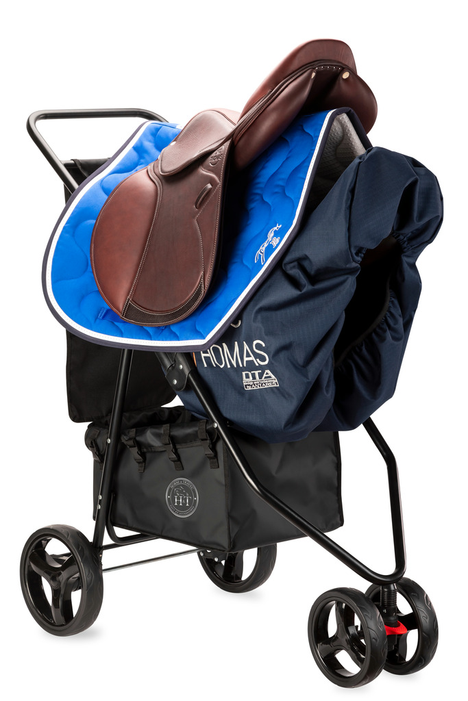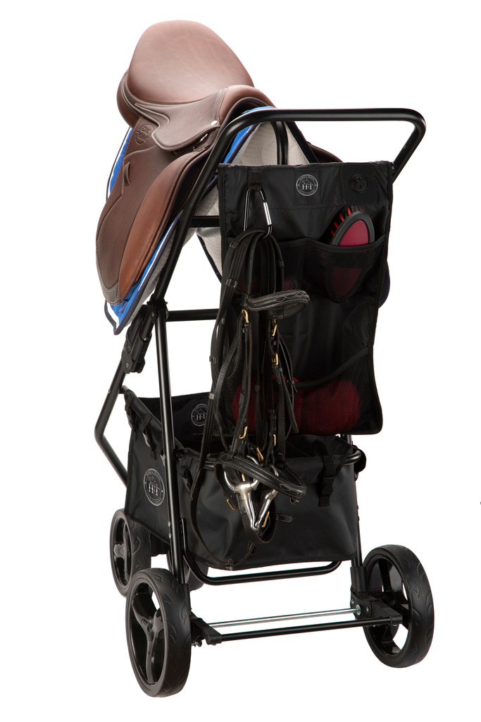 Feito de metal negro, o carro para selins (2) HORSE&TRAVEL é um acessório de equitação práctico, útil e elegante. Encaixa-se e desemcaixa-se com duas barras para selins e dois acessórios de armazenamento (cesta e dianteira de limpeza) em muito pouco tempo. Também inclui uma capa de protecção (rain cover) e uma bolsa de armazenamento e de transporte.
