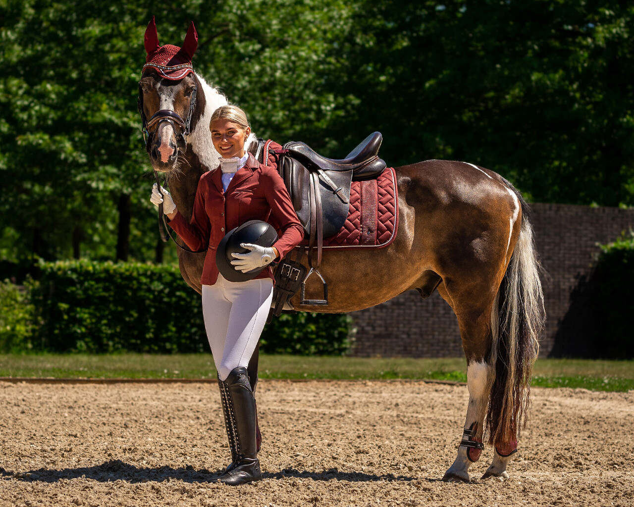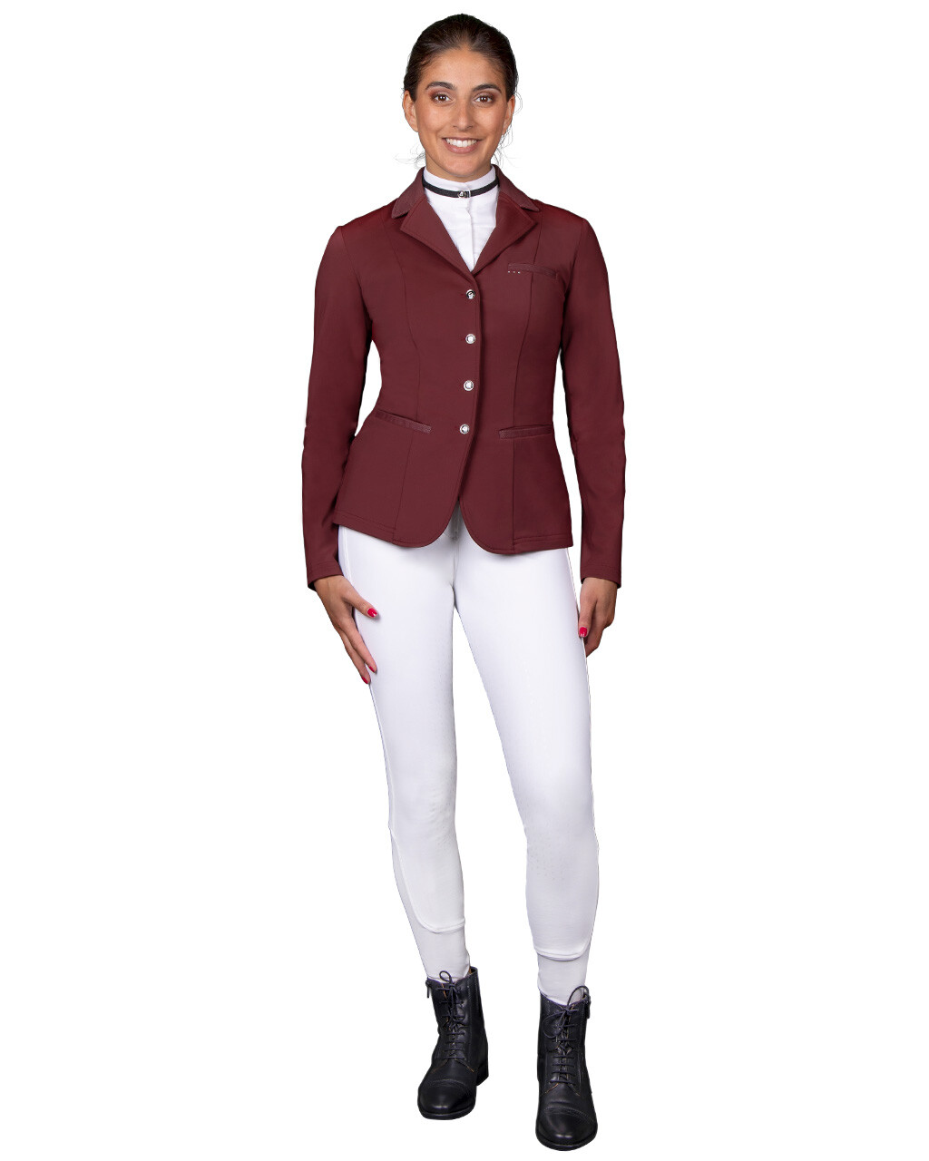 Casaca de competição em tecido softshell 4-way stretch respirável com abertura atrás, botões com logotipo QHP e três brilhantes na zona direita do peito.