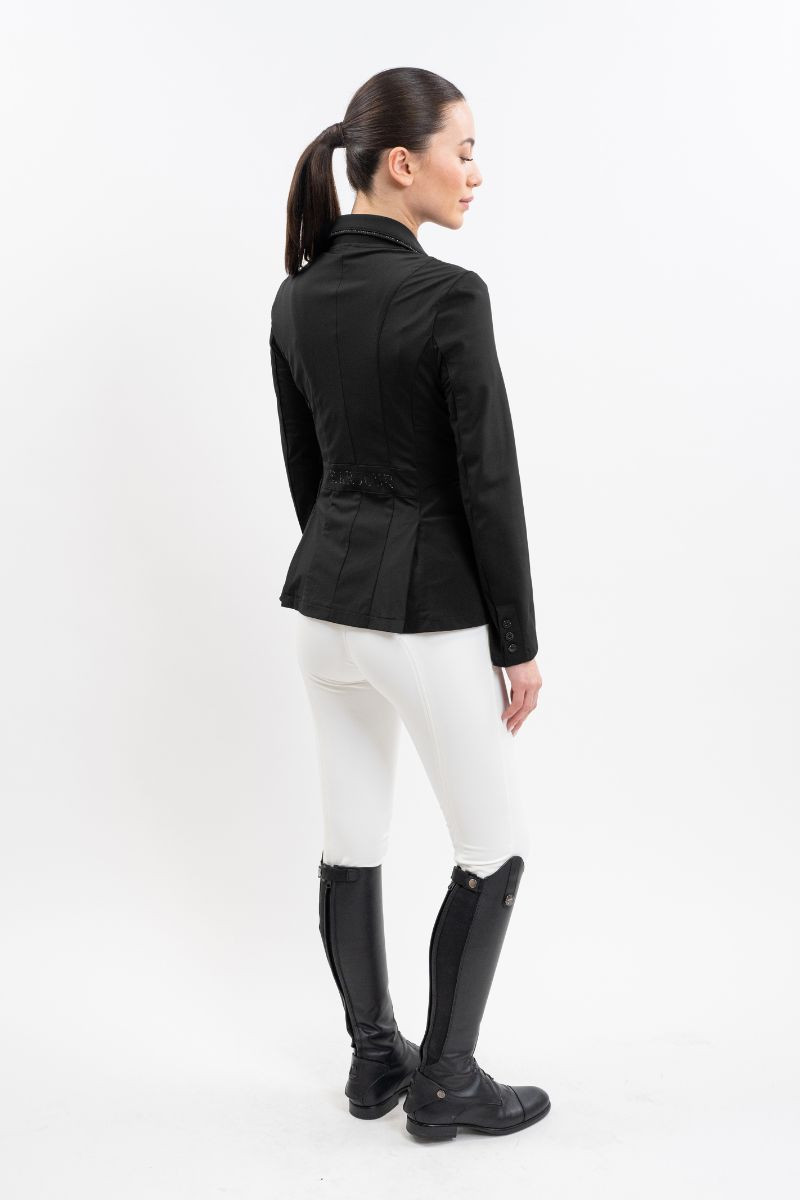 - Detalhe de três botões em tom strass na parte inferior das mangas;
