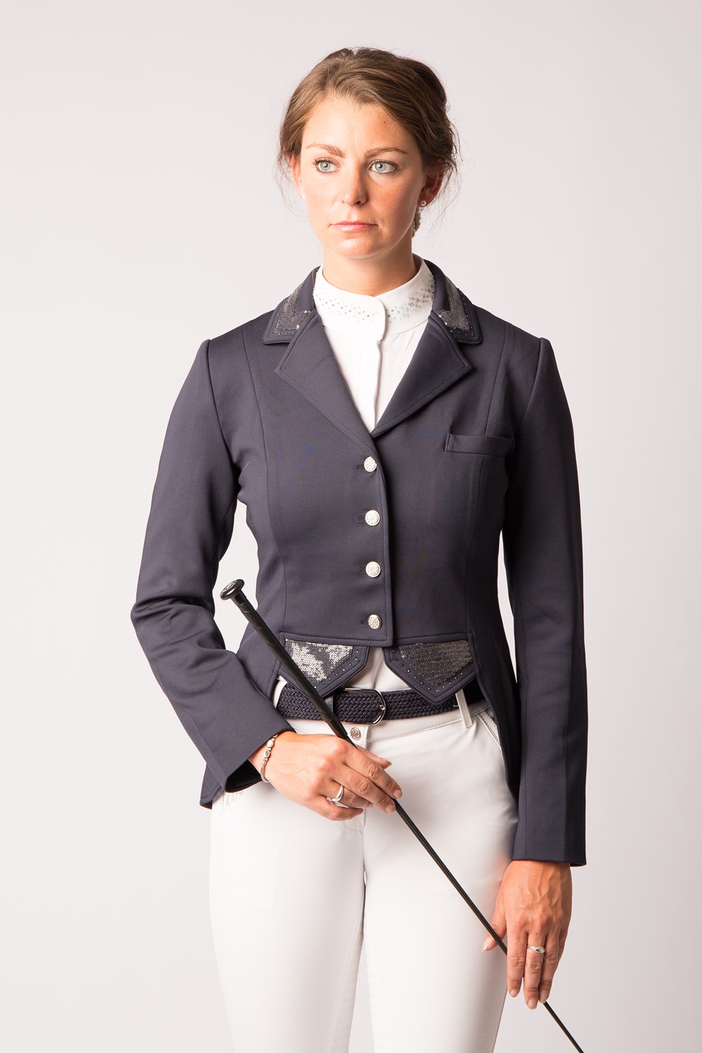 Luxuosa casaca de concurso em Softshell elástico de alta qualidade. Com botões cristais na frente juntamente com fecho zipper por baixo para maior conforto.