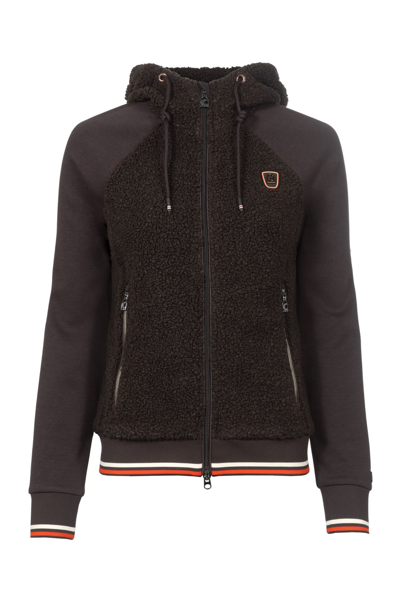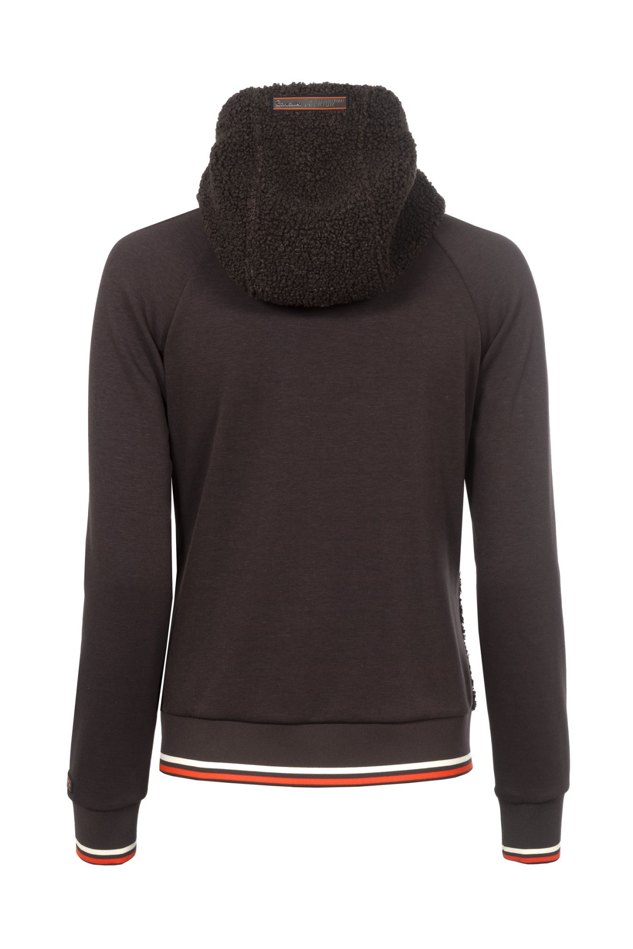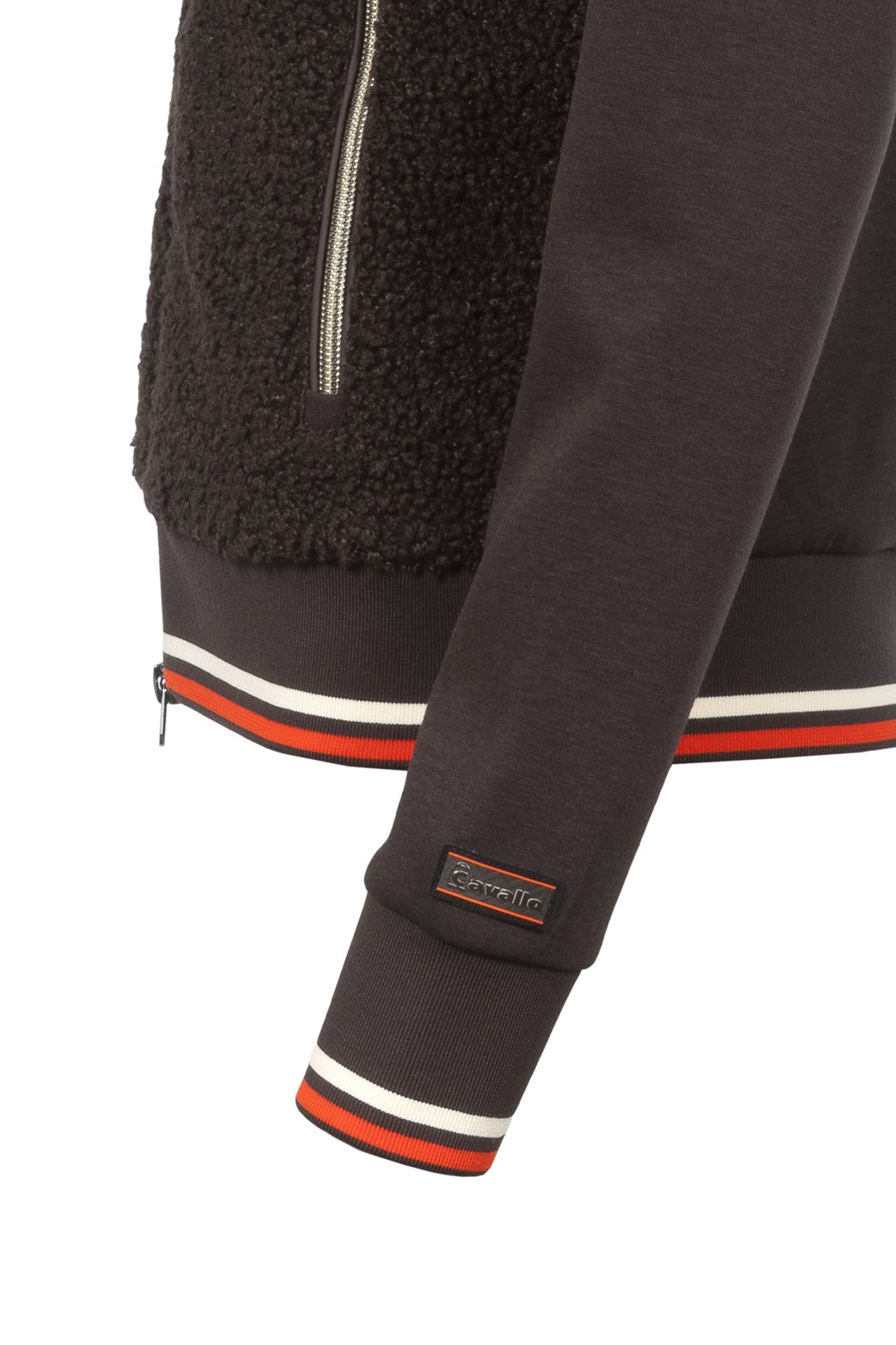 - O capuz pode ser fixado na parte de trás com um botão de pressão e possui uma etiqueta Cavallo na borda traseira;