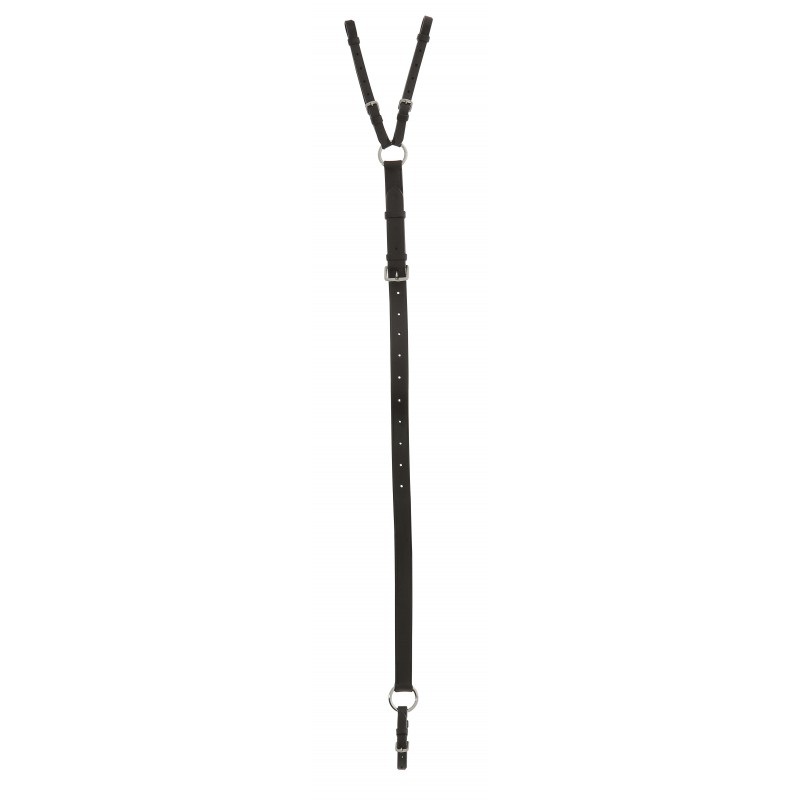 Chambon de couro de búfalo que junta as anilhas dianteiras da sela à cachaceira da cabeçada impedindo ao equino de puxar a cabeça para a frente. Ajustável do tamanho shetland ao full. Ferragens de latão niquelado.
