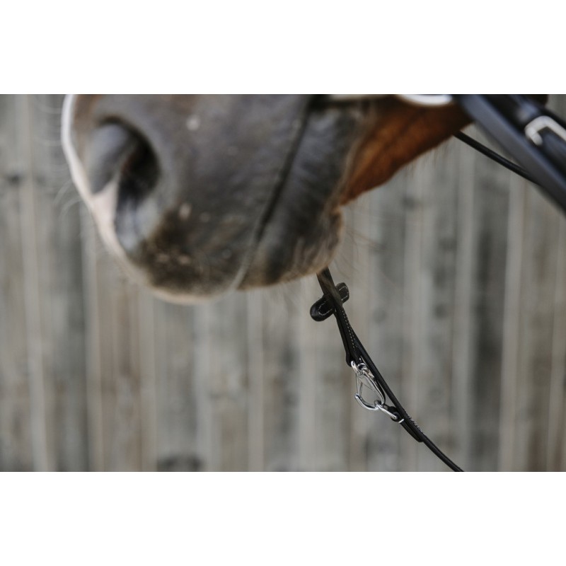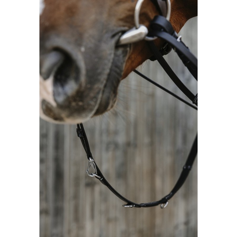Chambón de couro de búfalo. Com rédeas de lona. Actua de forma similar às rédeas alemãs mas o cavaleiro apenas tem um par de rédeas na mão. Ferragens de aço inoxidável.