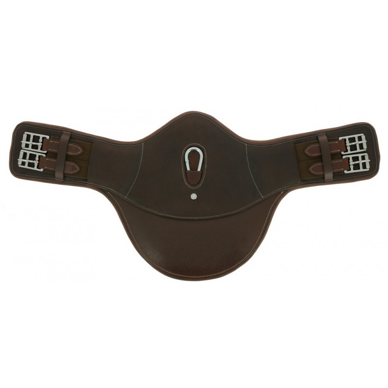 Cilha babete curta de couro de vitela acolchoado de espuma EVA de 4 mm. Parte baixa do babete reforçada de couro de búfalo granulado. Costuras contrastadas.