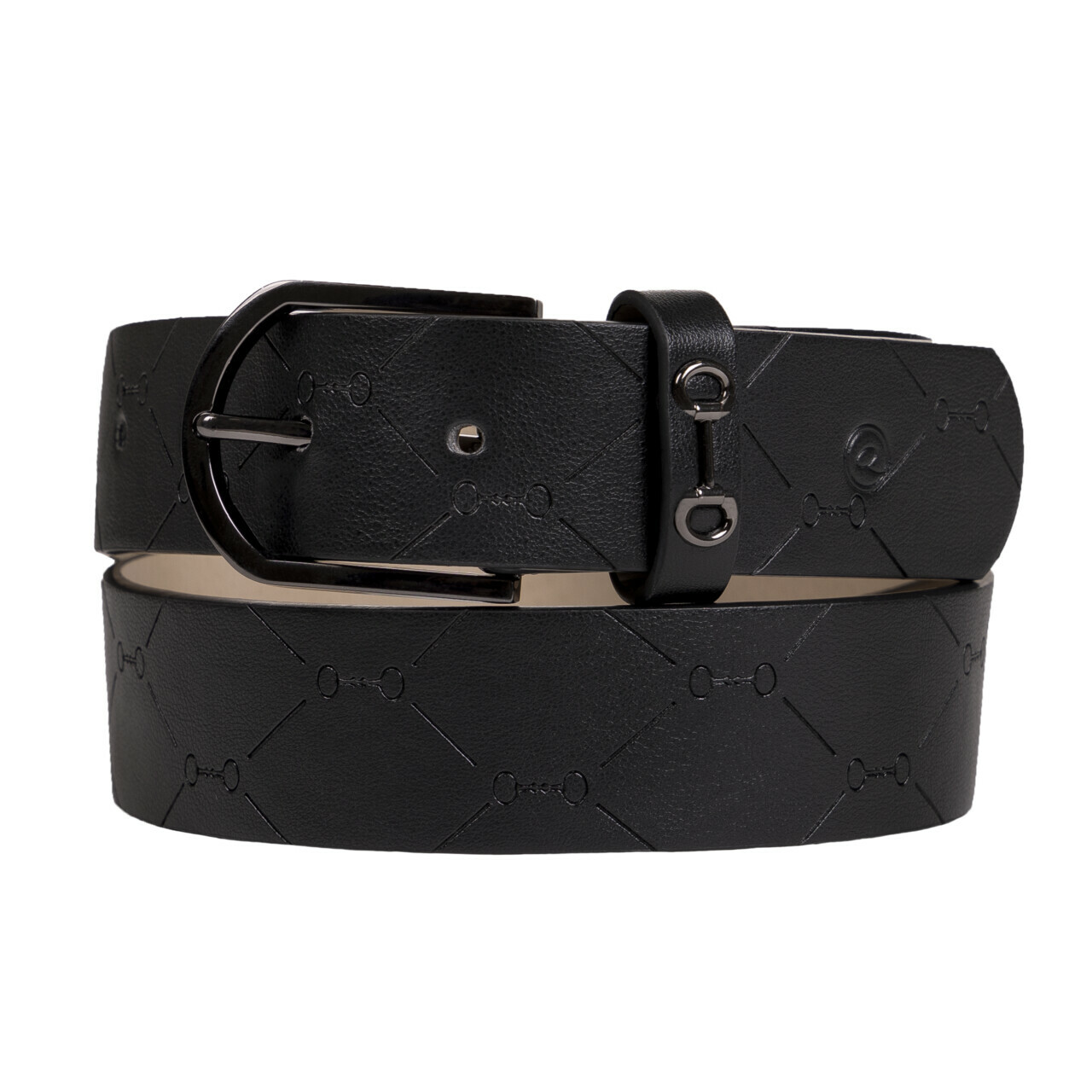 Cinto de couro luxuoso com padrão de bridões e com fivela preta.