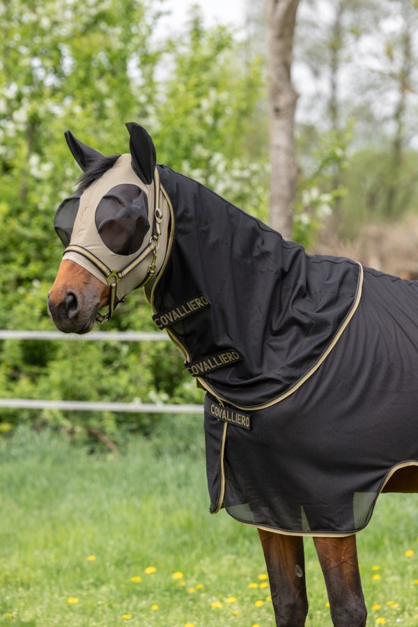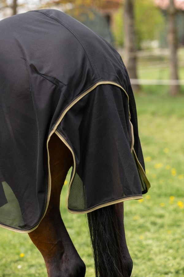 Os fechos de velcro no pescoço e no peito permitem um ajuste individual. Além disso, é resistente aos raios UV, garantindo a proteção do seu cavalo mesmo em dias ensolarados.