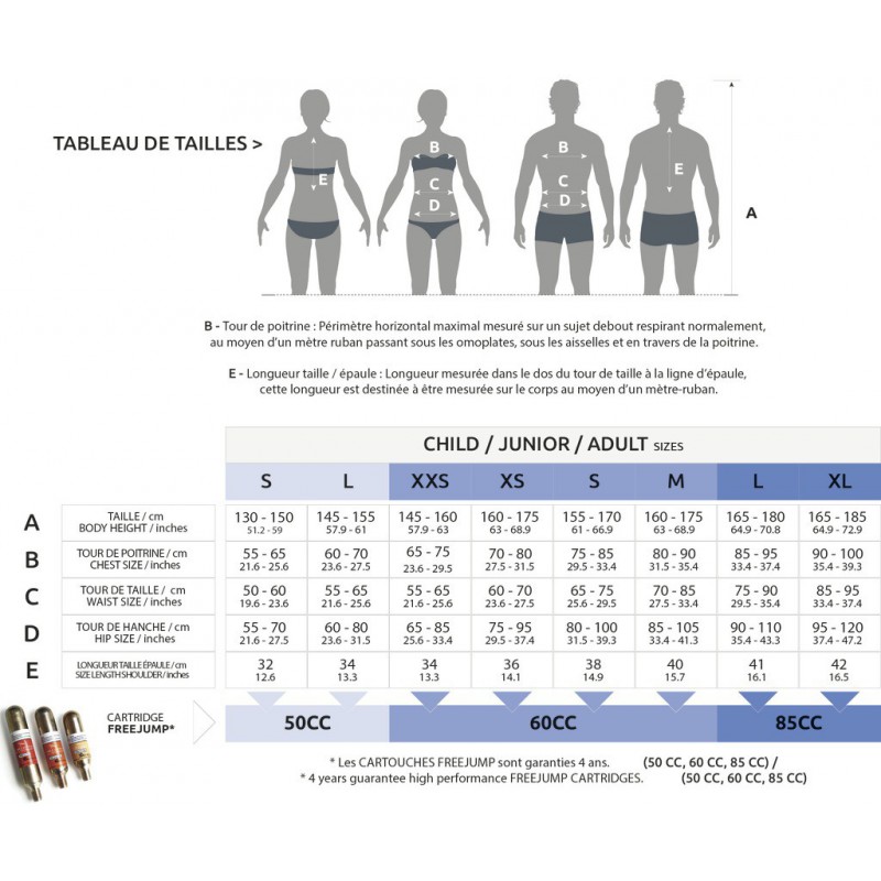 Colete Airbag compatível com os cartuchos Freejump de 50cc para o modelo junior e 60cc para os modelos de adulto.