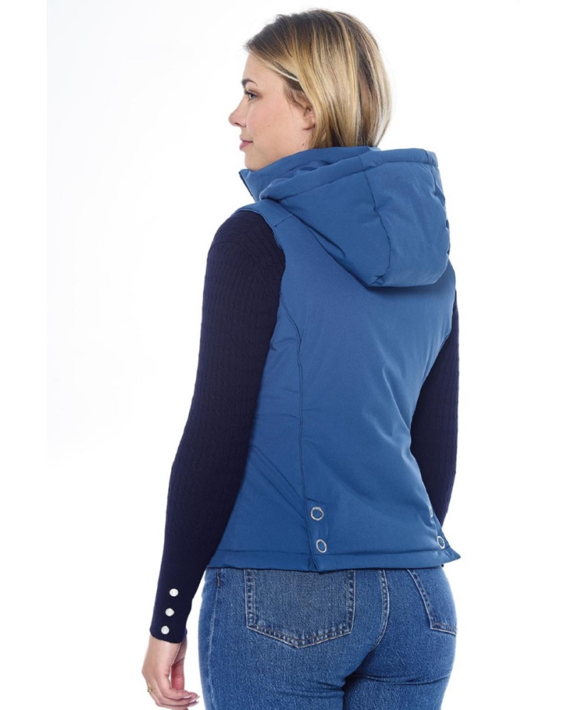 Colete feminino de corte ajustado ao corpo, com capuz removível.
