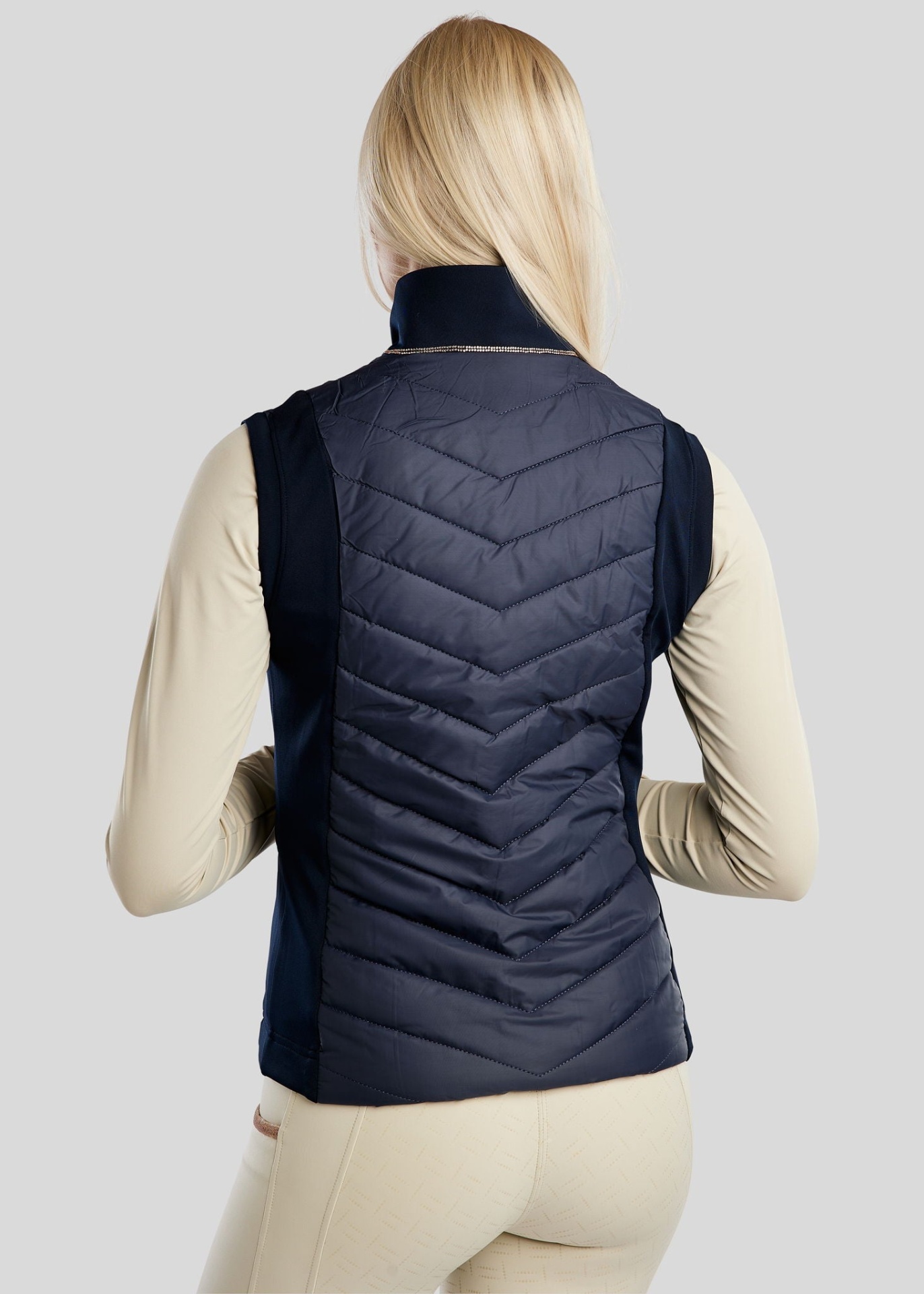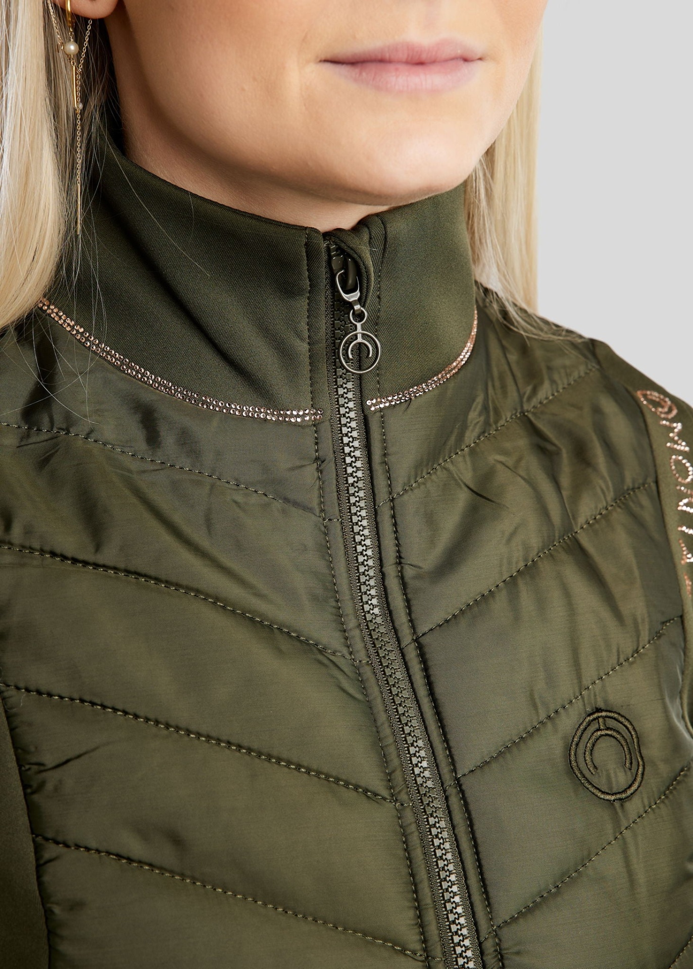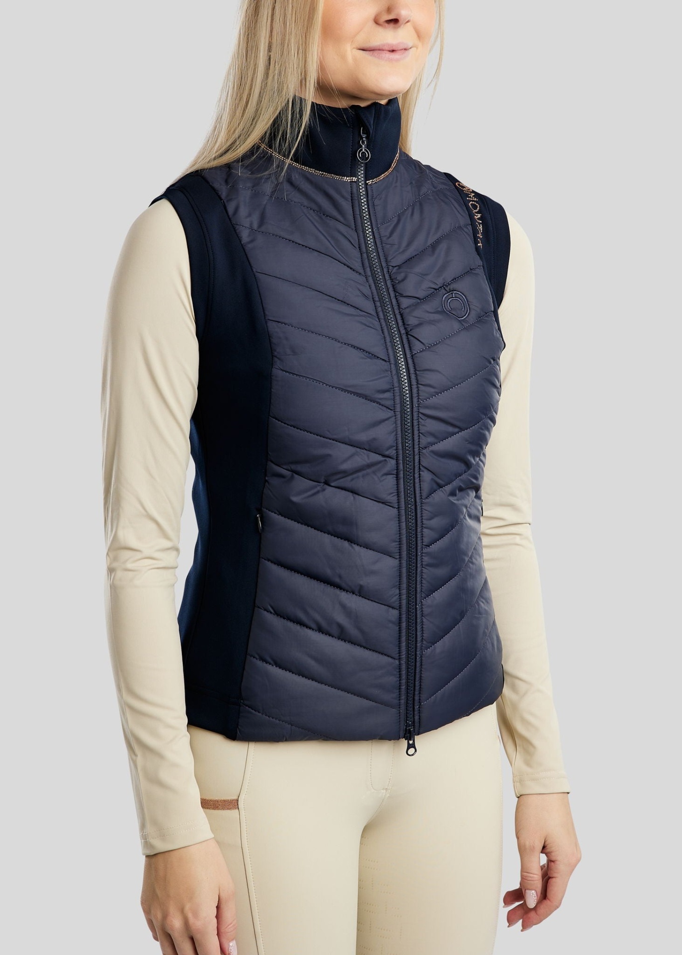 Detalhes em cristais rosegold: O colete apresenta duas fileiras de cristais em redor do decote e o icónico logótipo Montar num dos ombros, ambos adornados com cristais rosegold, acrescentando um toque luxuoso e sofisticado.