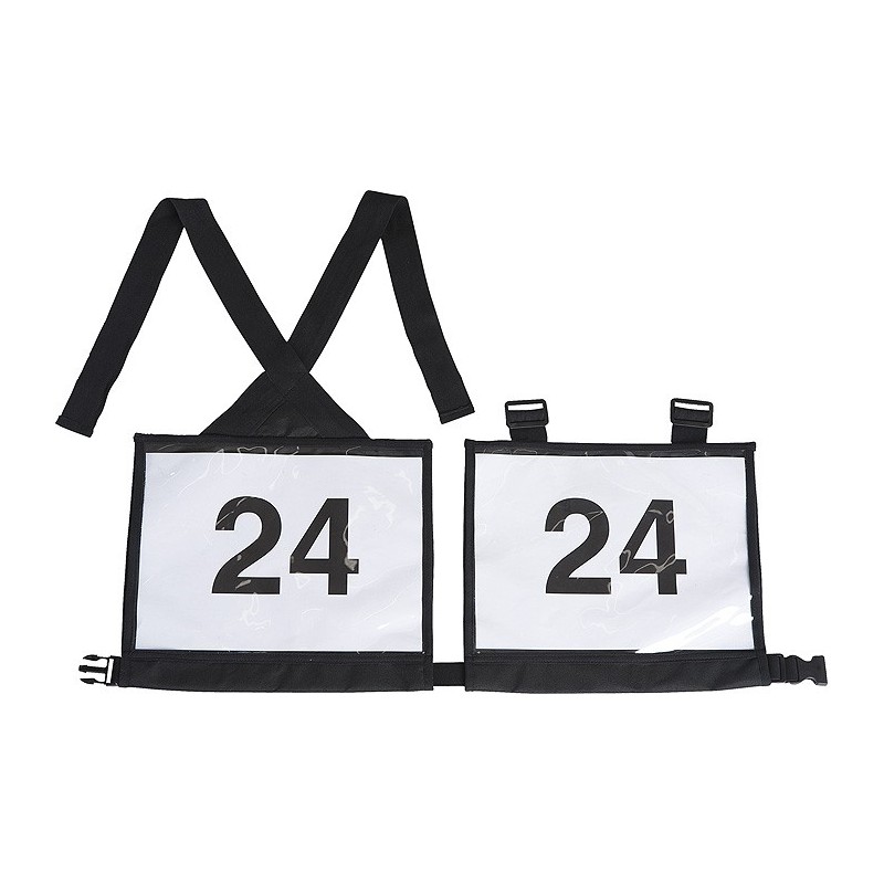 De poliéster impermeável, com bolsos para números recto/verso de P.V.C. transparente. Fecho com correias de polipropileno e cinto elástico com clip. Para as provas de cross, de trek, ou de raid...