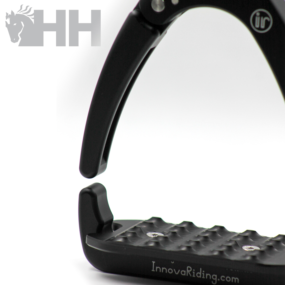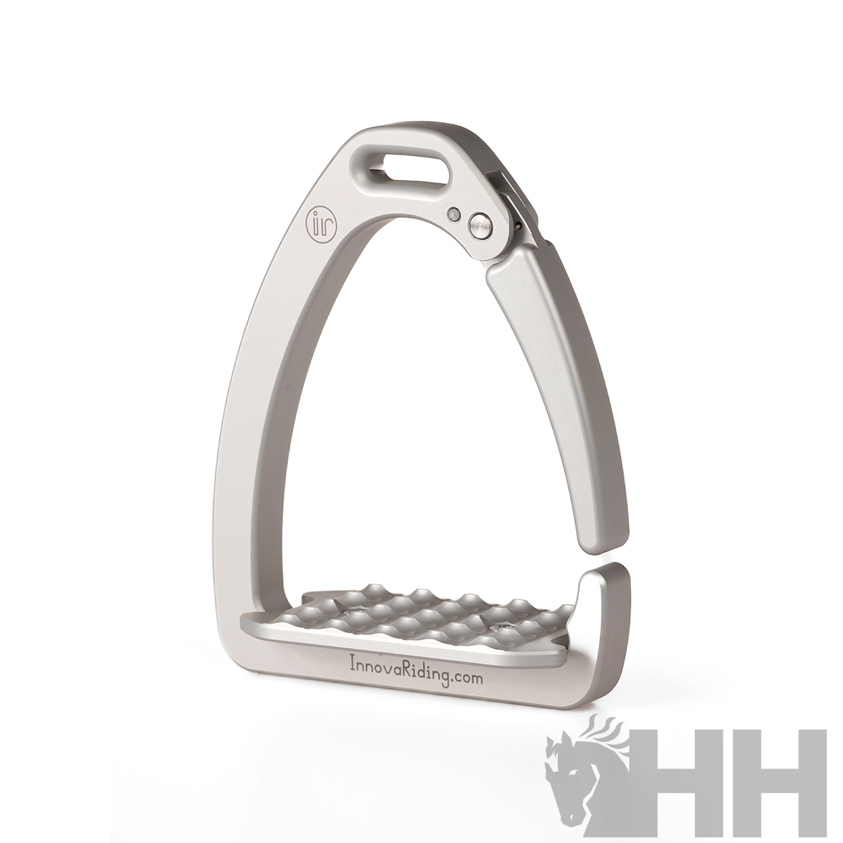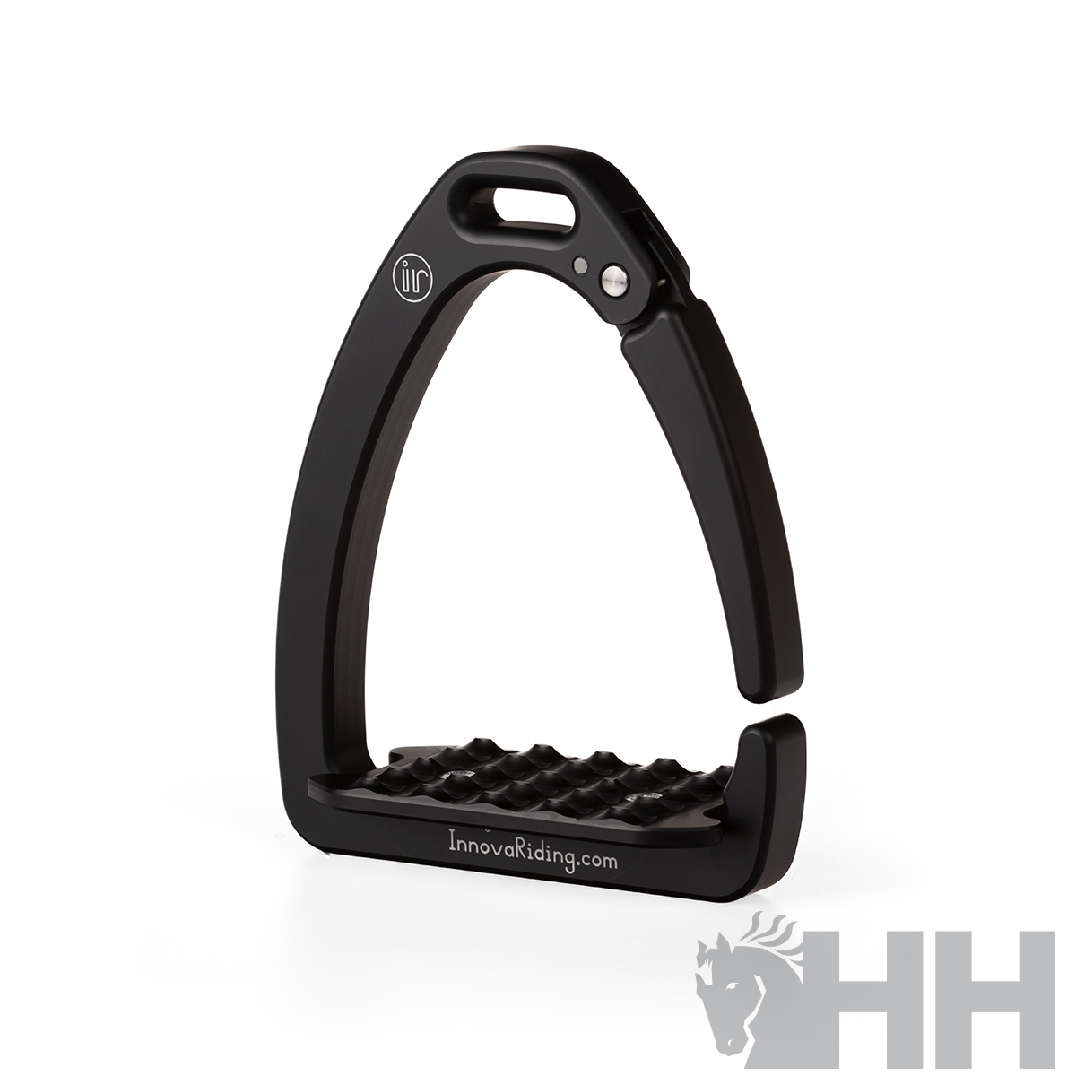 Os estribos de equitação Innova são especialmente criados para que se sinta seguro ao montar. Caso necessário, a parte móvel abre-se permitindo que o pé se solte dos estribos, voltando automaticamente para a posição fechada.