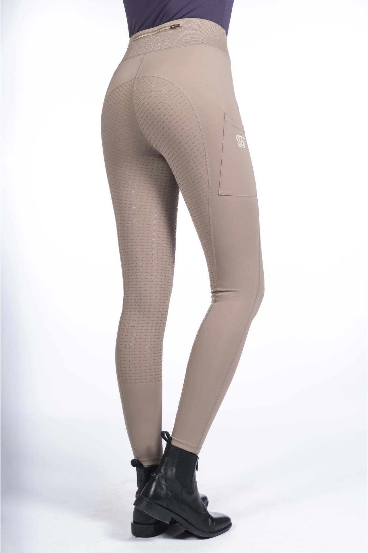 Leggings de equitação com assento em silicone, bolso lateral para o telemóvel e cristais decorativos.