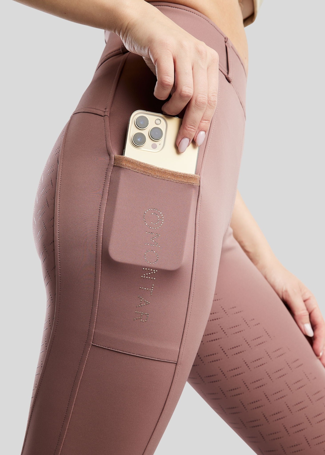 Detalhes elegantes em caviar rosegold: Apresentam uma deslumbrante fita em caviar rosegold nos dois bolsos para telemóvel, acrescentando um toque sofisticado e luxuoso. O discreto logótipo da Montar está lindamente gravado em cristais rosegold num dos bolsos para telemóveis, acrescentando um brilho subtil de glamour e exclusividade.