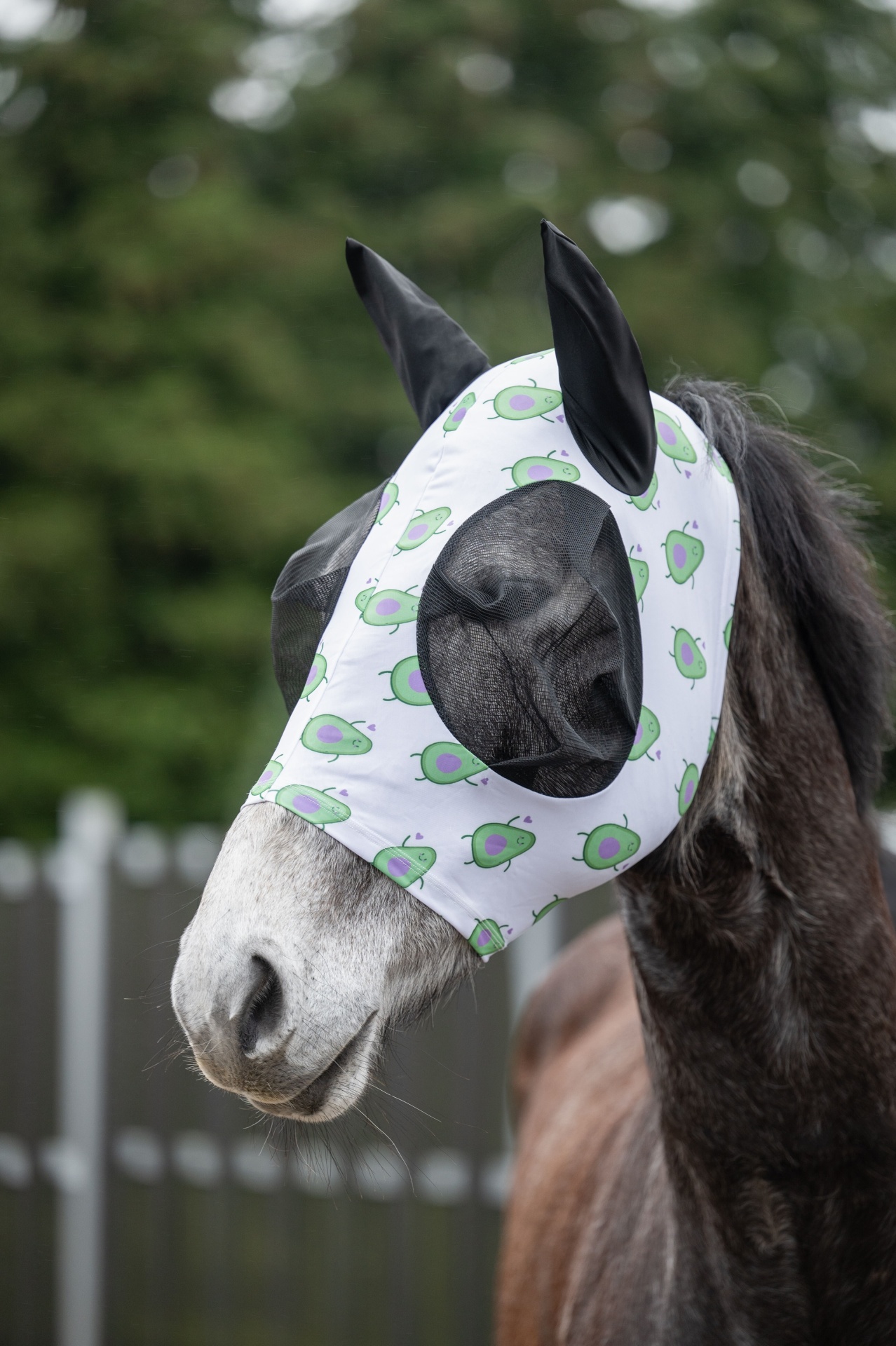 Máscara anti-moscas fabricada em material elástico e muito leve.