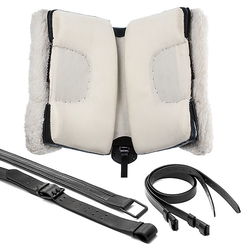 O kit completo inclui estribos vaqueros de metal forrados e acolchoados em couro, loros vaqueros, cilha vaquera, manta estribeira de lona com bolsos, rabicheira e zalea borrego sintético.