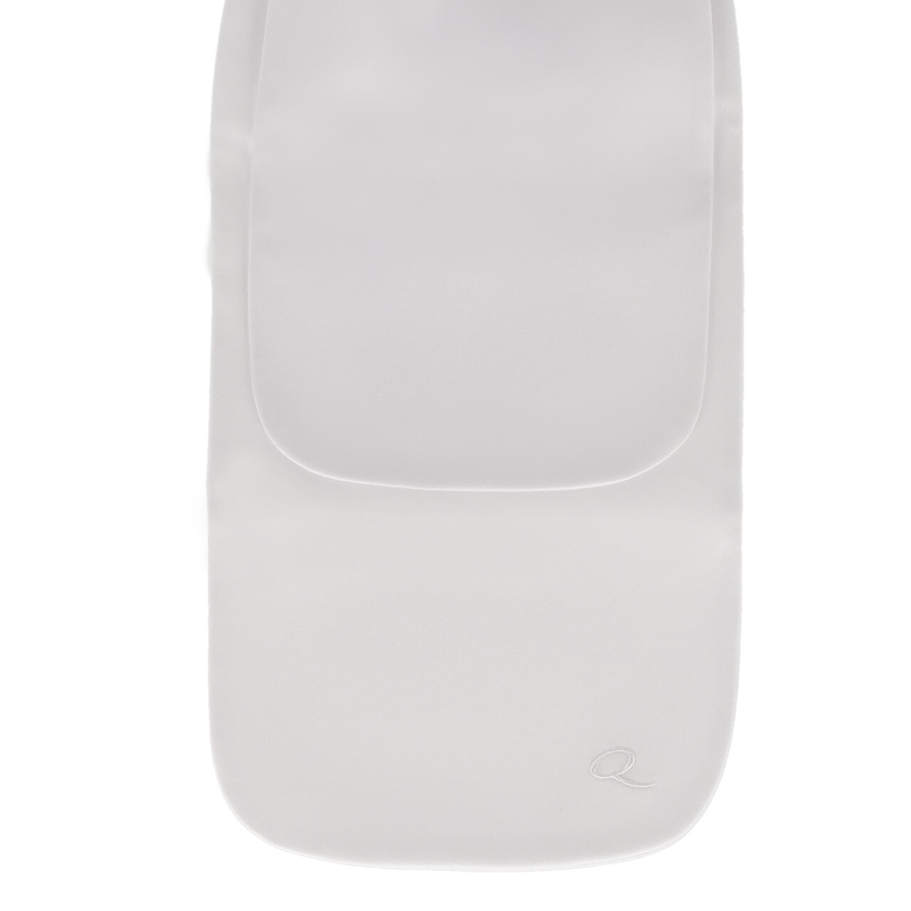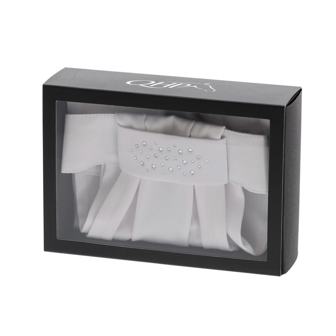Este plastron apresenta pequenos cristais em prateado, com um 'Q' da marca bordado na parte inferior.