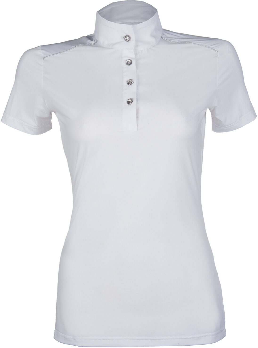 Pólo de concurso de manga curta, fabricado em tecido leve, elástico e respirável.