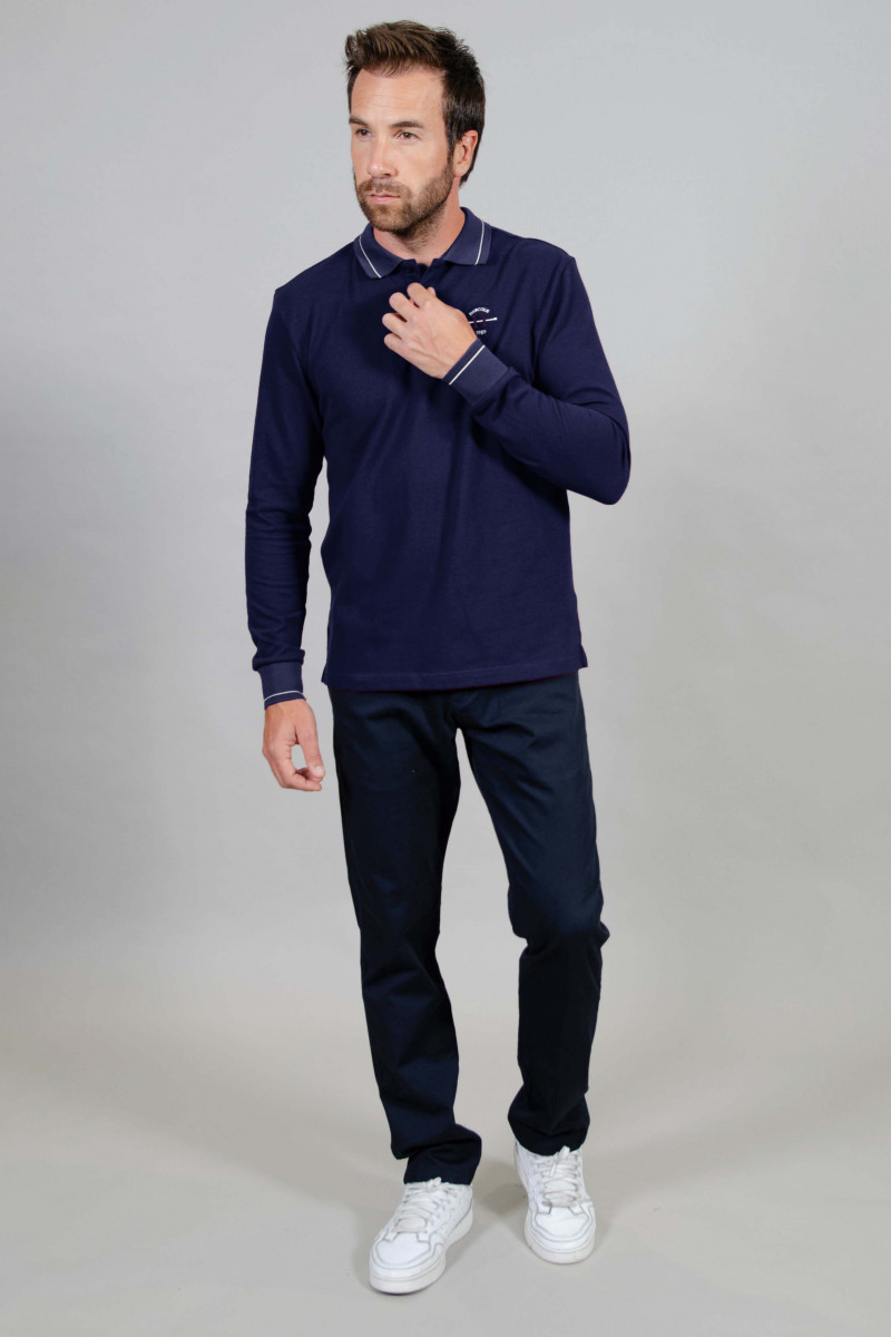Pólo de manga comprida, fabricado em tecido de algodão piquet elástico que proporciona maior conforto e elegância.