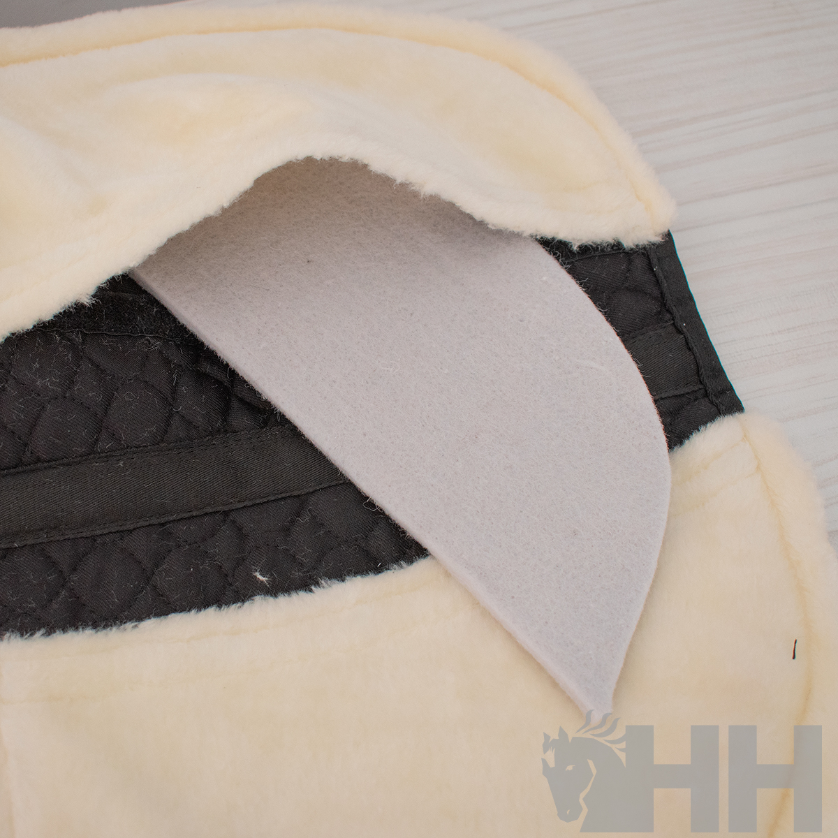 Protector de dorso de algodão fabricado com pêlo sintético e cunhas de feltro. Dispõe de bolsas interiores dianteiras e traseiras com fecho de velcro de forma a ser possível colocar ou retirar as cunhas para equilibrar a sela sobre o cavalo.