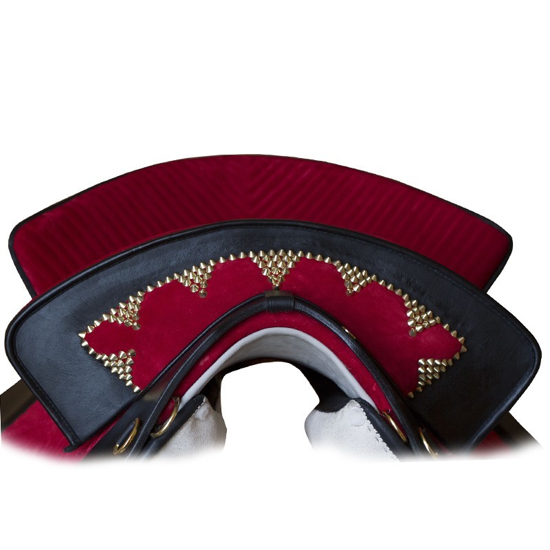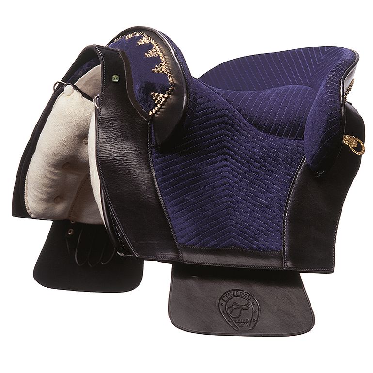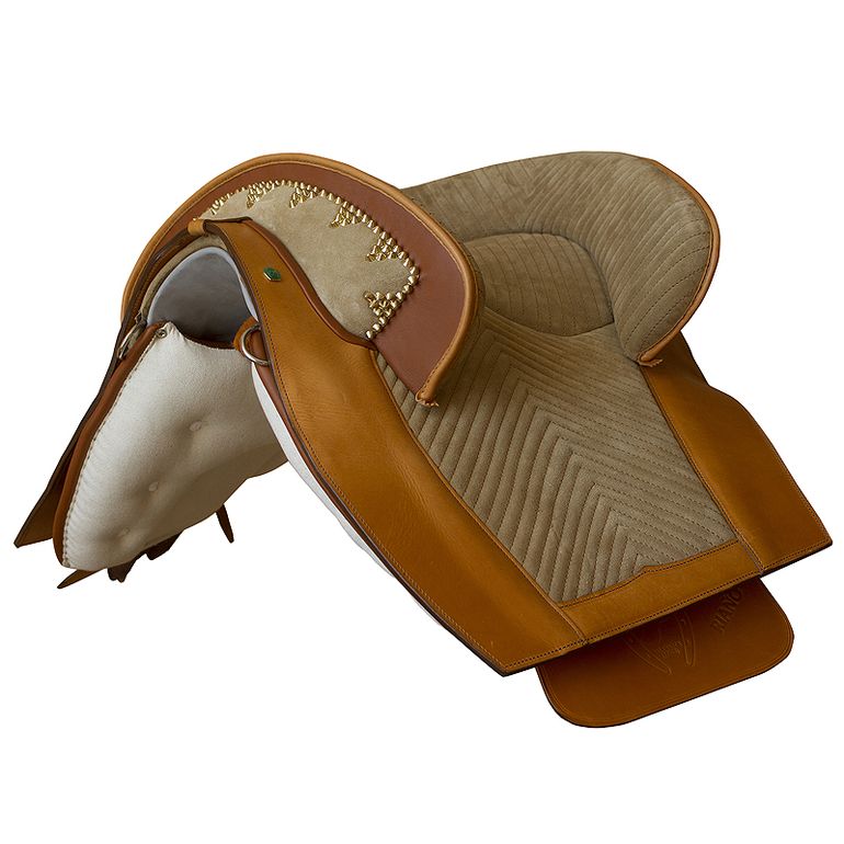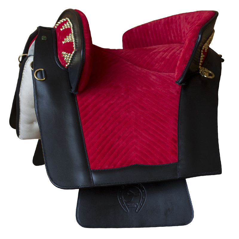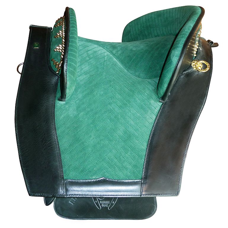 Preciosa sela de montar do mais puro estilo português, em suave camurça combinado com couro de primeira qualidade e rebordos decorados.