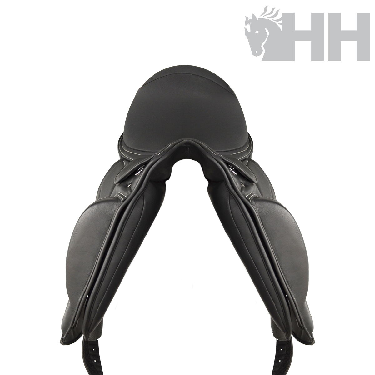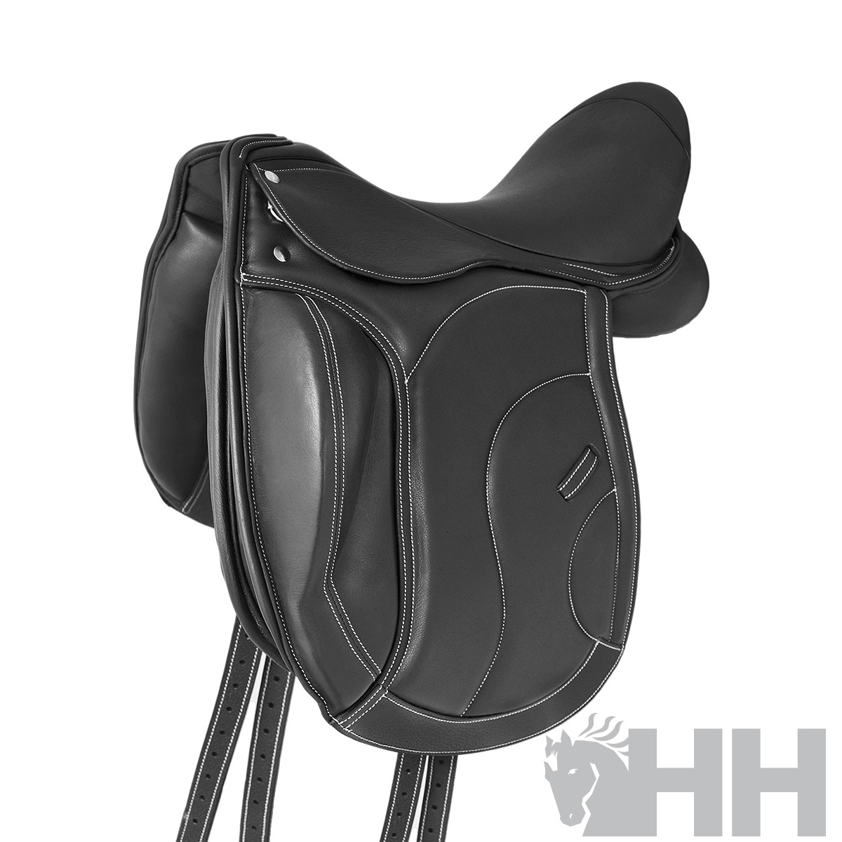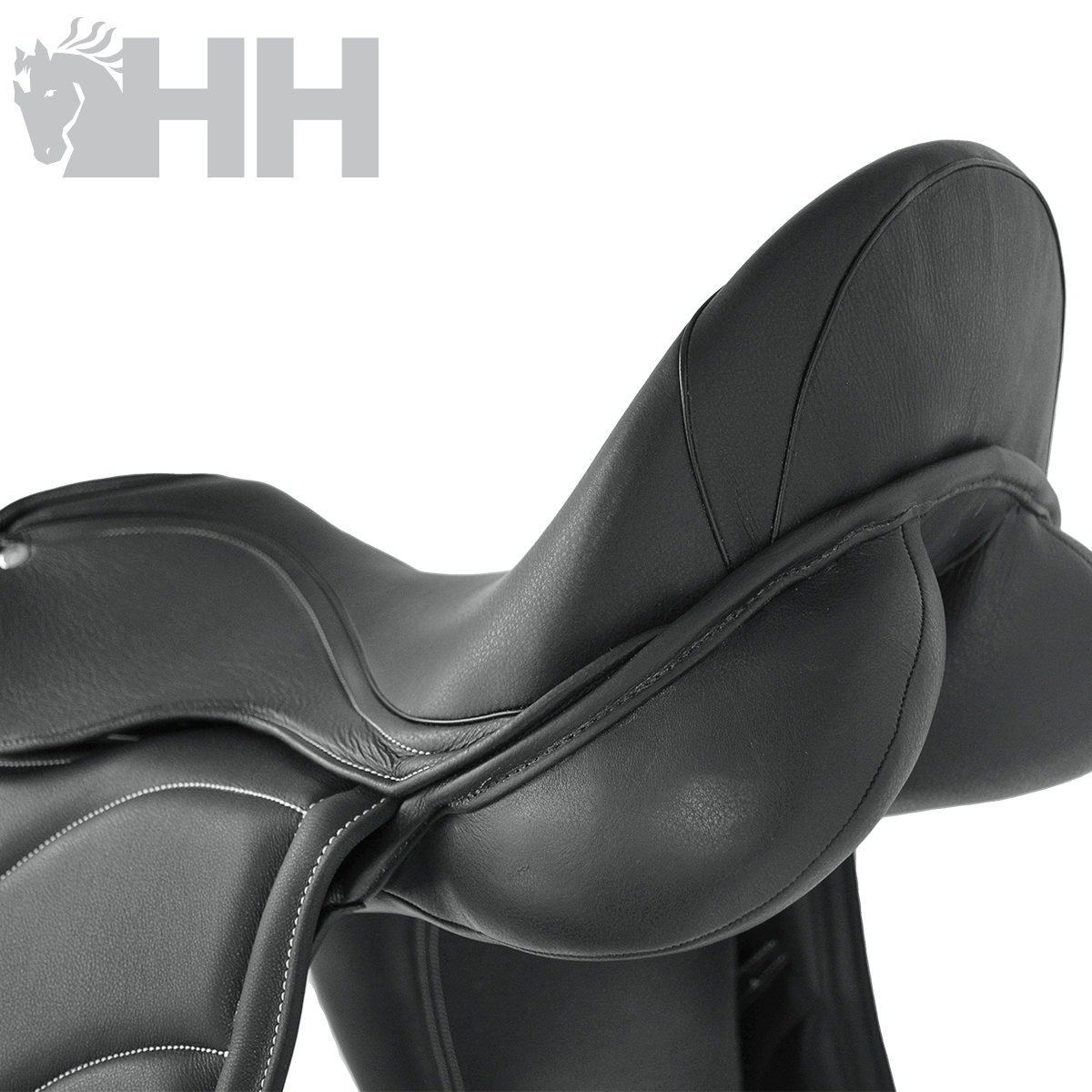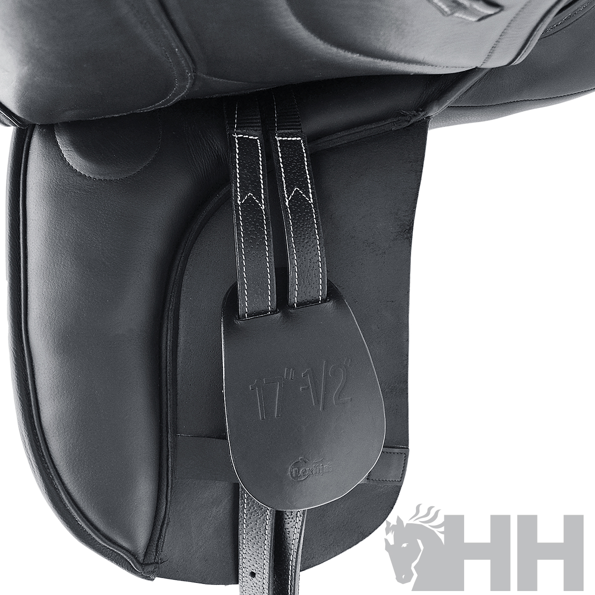 Selim fabricado com couro natural de alta qualidade e armadura de fibra resistente.
