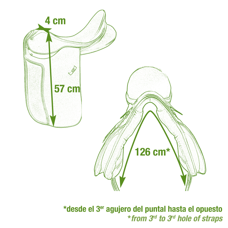 Muito confortável para cavaleiro e cavalo, com zona do joelhos acolchoada. Estupenda opção para practicar dressage. Equilibrado e elegante, fabricada com materiais de primeira qualidade.