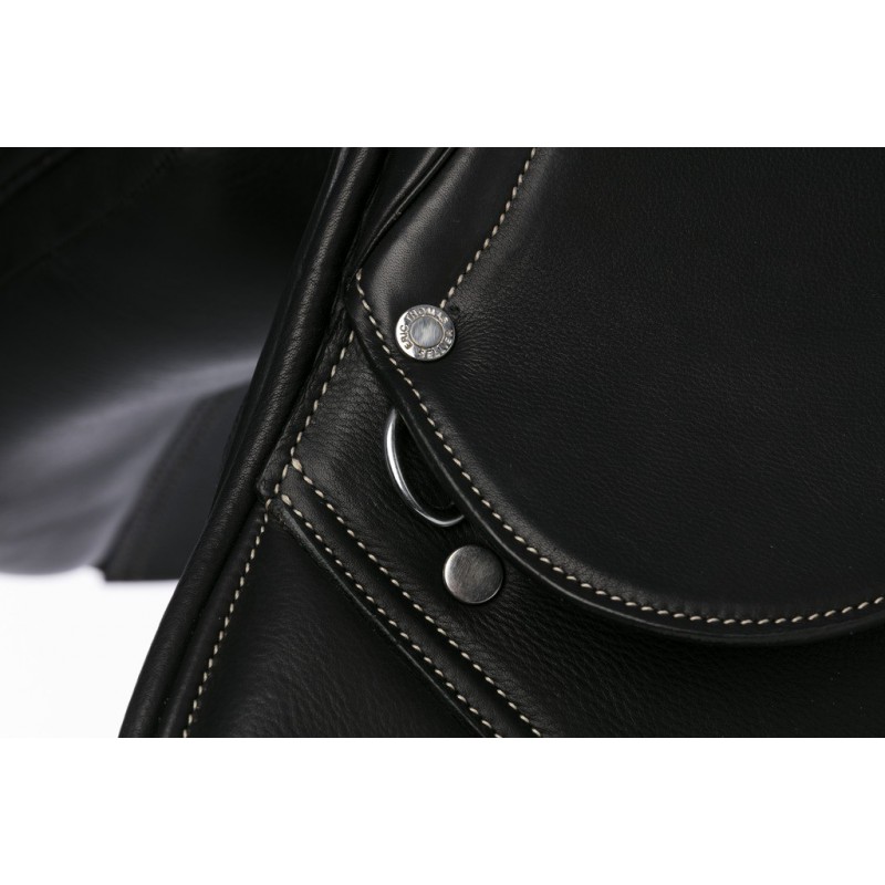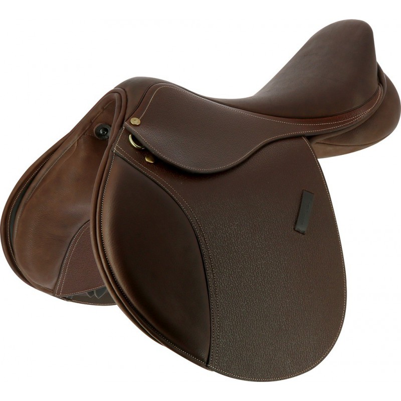 Selim de obstáculos adornado de sobrecosturas contrastadas com assento, acolchoados e zona frontal das abas de couro de vaca argentino e almofadas de couro de búfalo.
