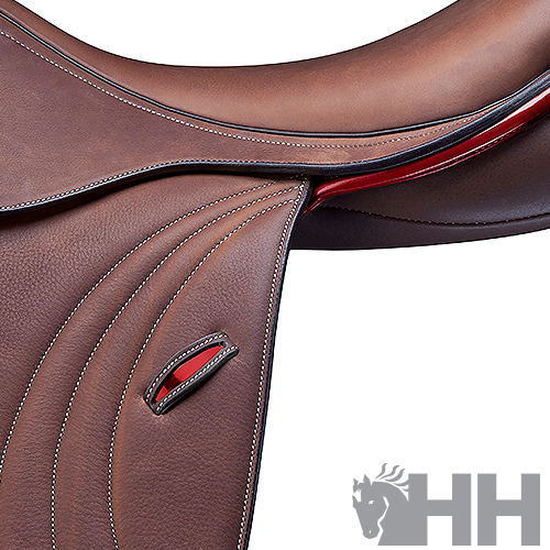 - Assento é semi plano e as almofadas estão fabricadas com a tecnologia AMS para um perfeito ajuste ao dorso do cavalo;