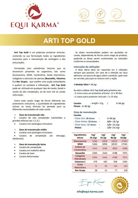 Formulado com substâncias naturais que se encontram presentes no organismo, tais como Glucosamina, MSM, Condroitina, Ácido Hialurónico, Colagénio e extractos de plantas (Boswellia, Vitamina C e Nor Grape), que contêm uma acção antioxidante e ajudam no combate à inflamação, Arti Top Gold pode ser utilizado em qualquer tipo de cavalo, desde o cavalo de alta competição, ao de lazer até ao cavalo reformado.