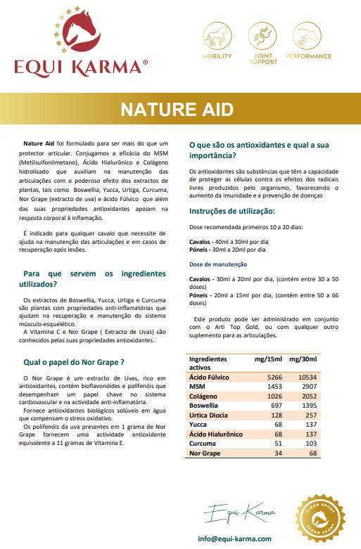 Nature Aid foi formulado para ser mais do que um protector articular. Conjugamos a eficácia do MSM (Metilsulfonilmetano), Ácido Hialurônico e Colágeno hidrolisado que auxiliam na manutenção das articulações com o poderoso efeito dos extractos de plantas, tais como Boswellia, Yucca, Urtiga, Curcuma, Nor Grape (extracto de uva) e ácido Fúlvico que além das suas propriedades antioxidantes apoiam na resposta corporal à inflamação. É indicado para qualquer cavalo que necessite de ajuda na manutenção das articulações e em casos de recuperação após lesões.
